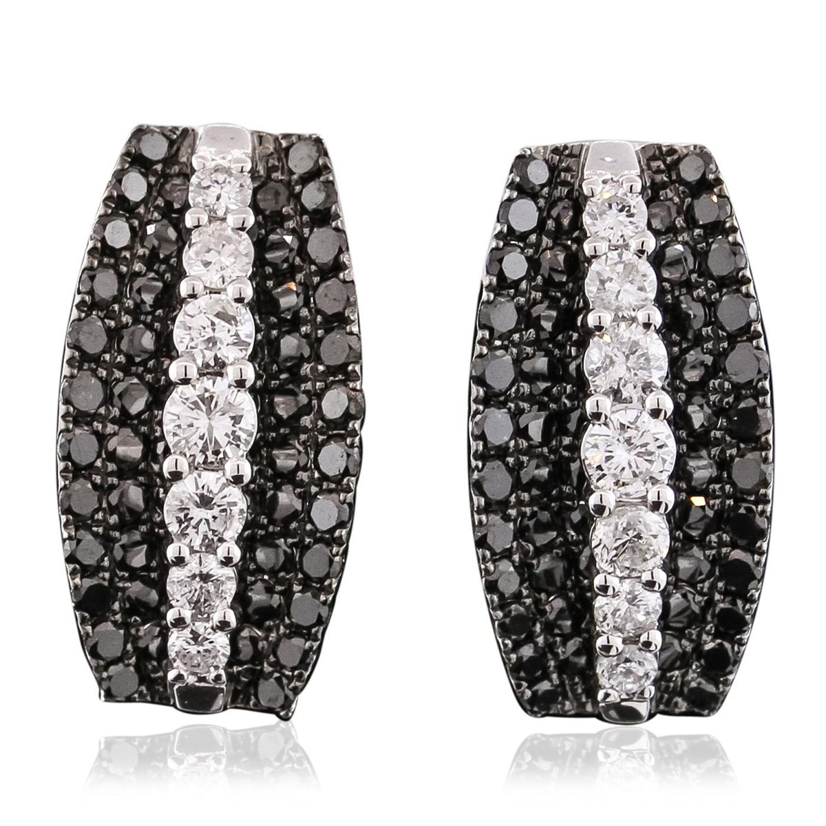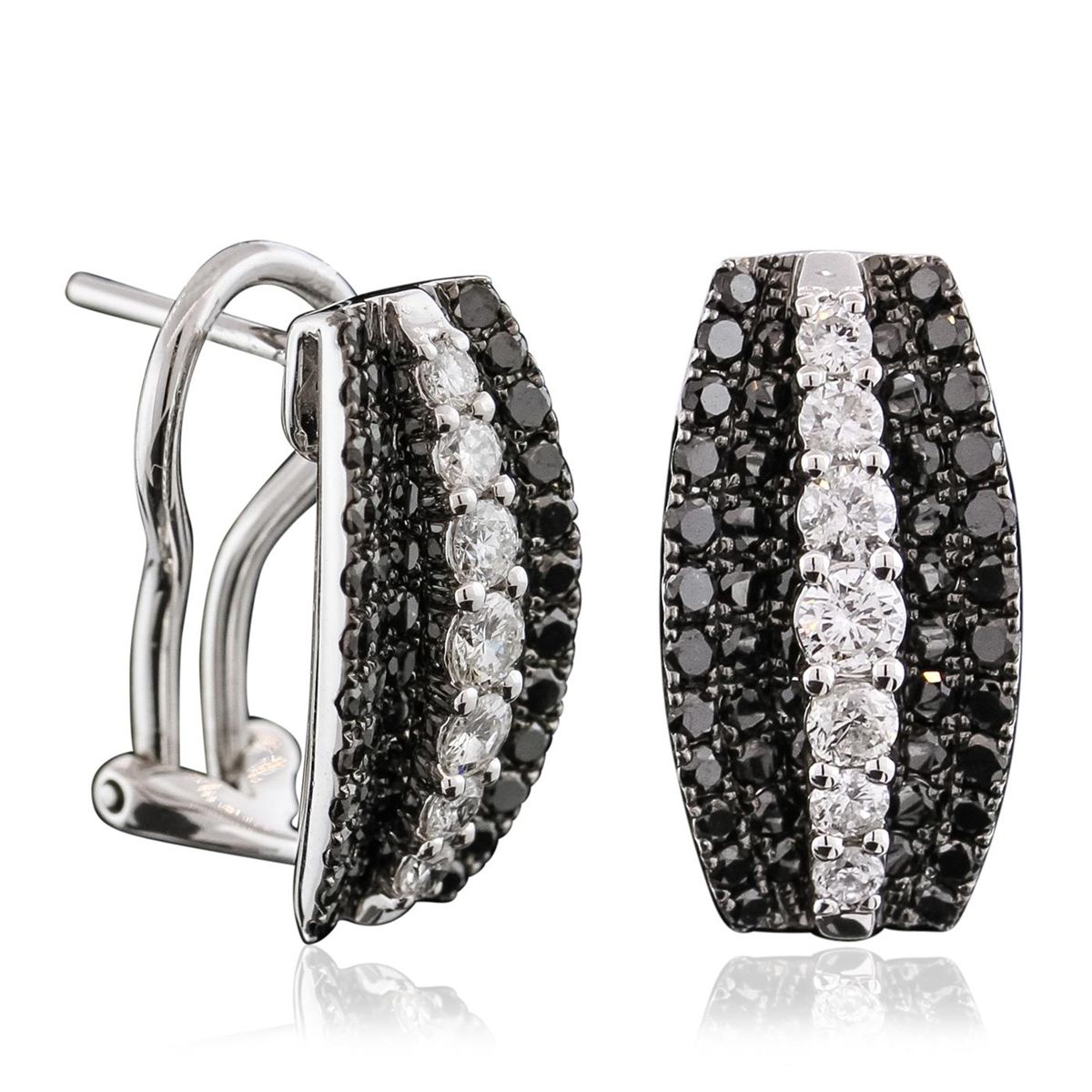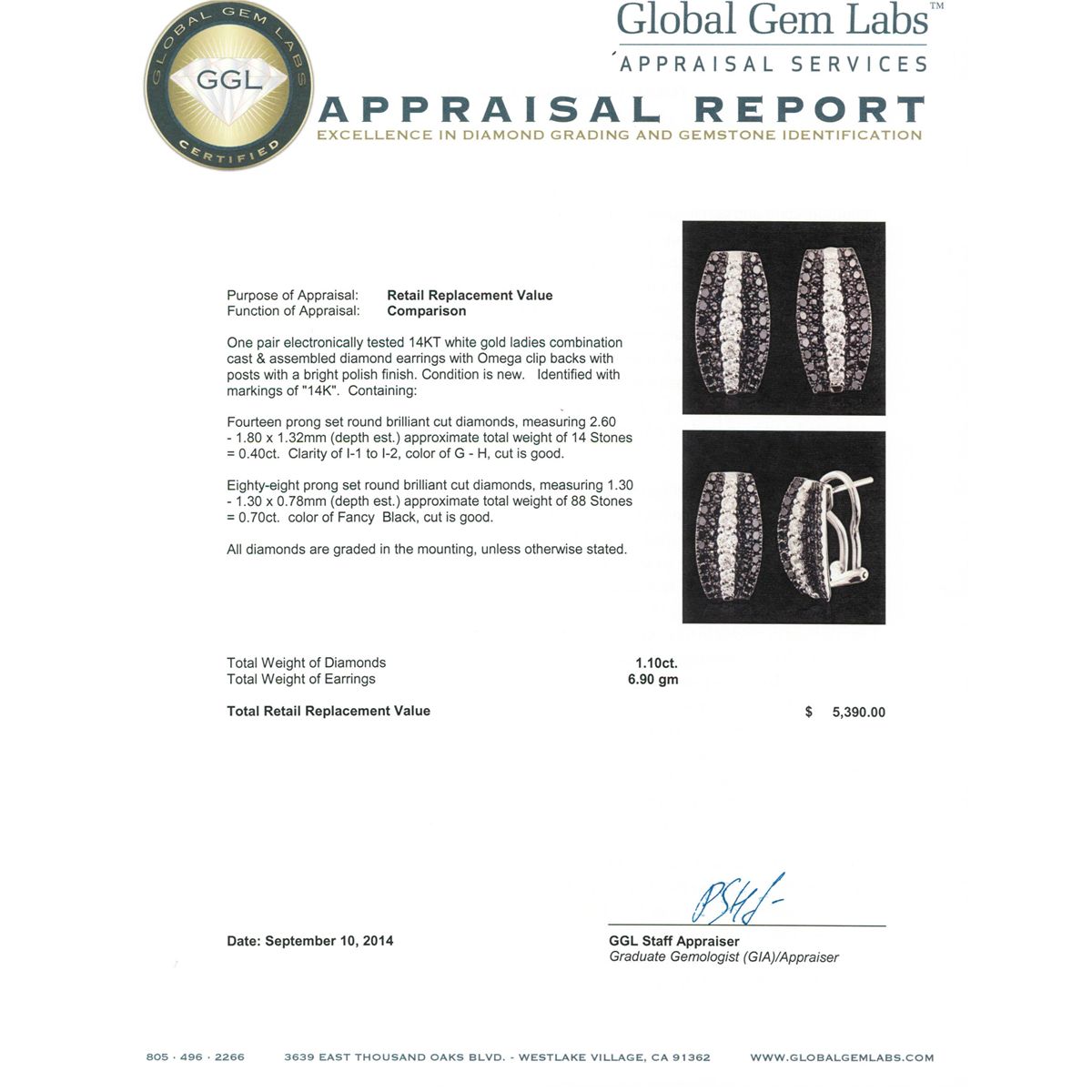 One pair electronically tested 14KT white gold ladies combination cast & assembled diamond earrings with Omega clip backs with posts with a bright polish finish. Identified with markings of "14K". Condition is new. Containing: Fourteen prong set round brilliant cut diamonds, measuring 2.60 - 1.80 x 1.32mm (depth est.) approximate total weight of 14 Stones = 0.40ct. Clarity: I-1 to I-2. Color: G - H, Cut is Good. Eighty-Eight prong set round brilliant cut diamonds, measuring 1.30 - 1.30 x 0.78mm (depth est.) approximate total weight of 88 Stones = 0.70ct. Cut is Good. All diamonds are graded in the mounting, unless otherwise stated. Total Weight of Diamonds 1.10ct. Total Weight of Earrings 6.90 grams. GGL Appraised at $5,390.00.