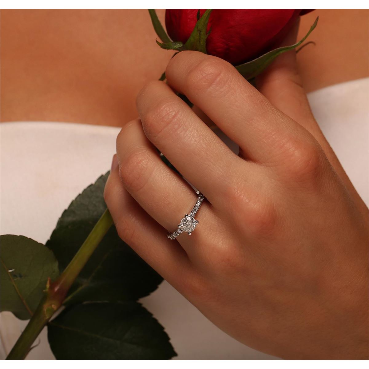 One electronically tested 14KT white gold ladies cast diamond unity ring with a bright polish finish. Condition is new, good workmanship. The featured diamond is supported by diamond set shoulders, completed by a two millimeter wide band. Identified with markings of "585". Containing: One prong set round brilliant cut diamond, measuring 5.65 - 5.60 x 4.00mm (depth est.) approximate weight of 0.80ct. Graded in the setting. Clarity: I-2. Color: 71.1%. Table 57.7%. Fourteen prong set round brilliant cut diamonds, measuring 1.70 - 1.60 x 0.99mm (depth est.) approximate. Total Weight of 14 Stones = 0.30ct. Graded in the setting. Clarity: VS-2 to SI-2. Color: G - I. Total Weight of Diamonds 1.10ct. Total Weight of Ring 2.81 grams. AIG Appraised at $6,215.00.