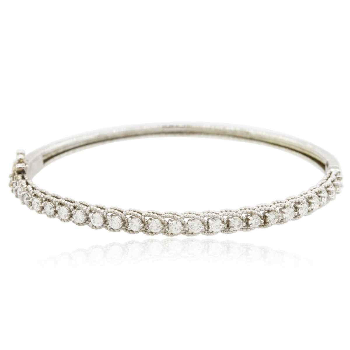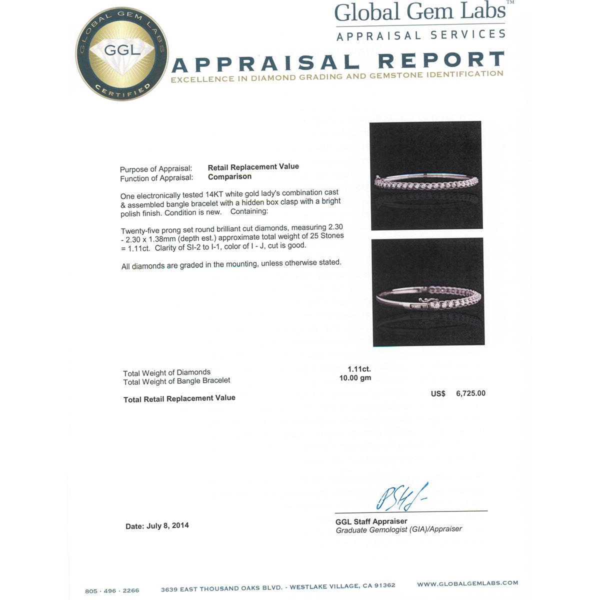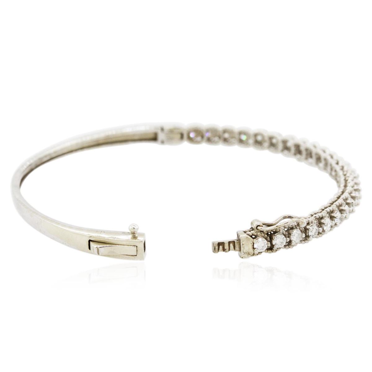 One electronically tested 14KT white gold Ladies combination cast & assembled bangle bracelet with a hidden box clasp with a bright polish finish. Condition is new. Containing: Twenty-Five prong set round brilliant cut diamonds, measuring 2.30 - 2.30 x 1.38mm (depth est.) approximate. Total Weight of 25 Stones = 1.11ct. Clarity: SI-2 to I-1. Color: I - J, Cut is Good. All diamonds are graded in the mounting, unless otherwise stated. Total Weight of Diamonds 1.11ct. Total Weight of Bangle Bracelet 10.00 grams. GGL Appraised at $6,725.00.