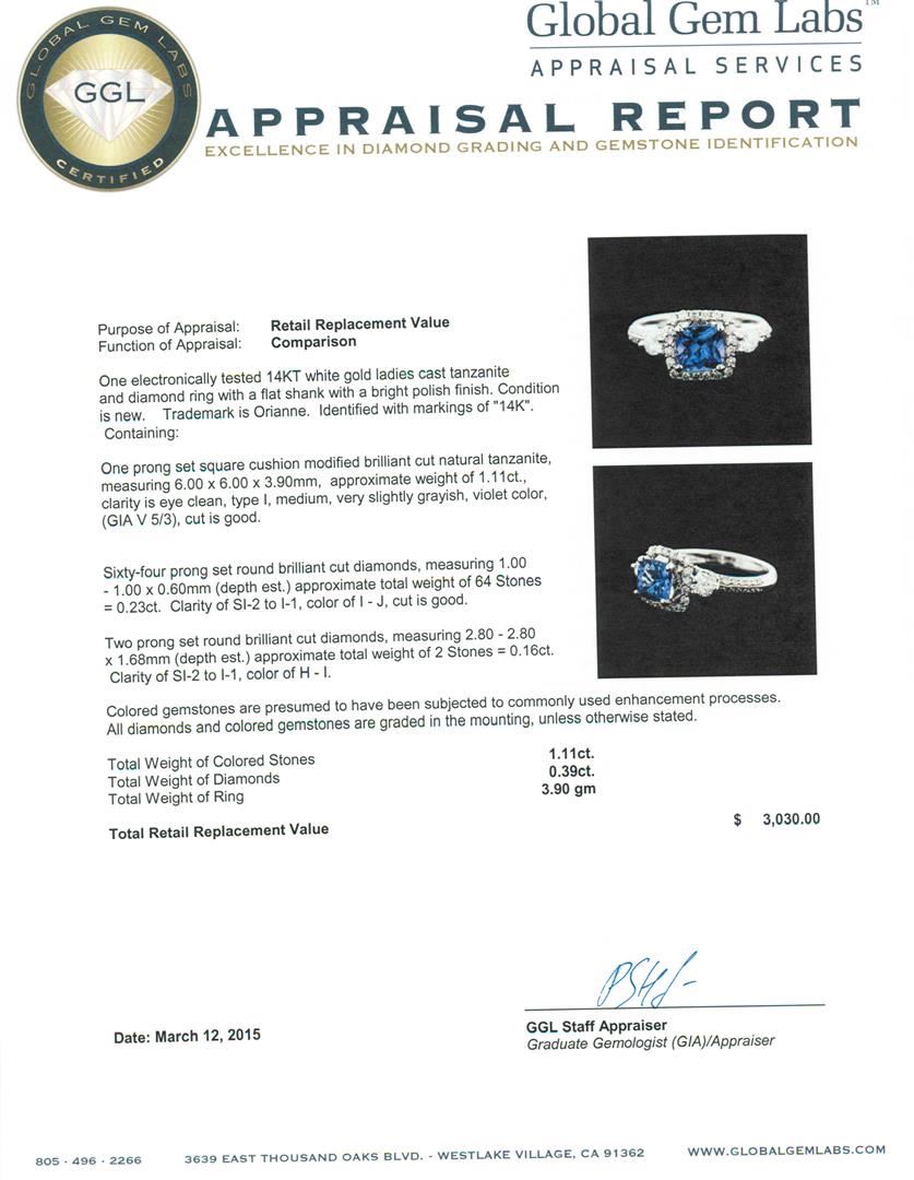 One electronically tested 14KT white gold ladies cast tanzanite and diamond ring with a flat shank with a bright polish finish. Trademark is Orianne. Identified with markings of "14K". Condition is new. Containing: One prong set square cushion modified brilliant cut natural tanzanite, measuring 6.00 x 6.00 x 3.90mm, approximate weight of 1.11ct., clarity is eye clean, type I, medium, very slightly grayish, violet color, (GIA V 5/3), cut is good. Sixty-Four prong set round brilliant cut diamonds, measuring 1.00 - 1.00 x 0.60mm (depth est.) approximate total weight of 64 Stones = 0.23ct. Clarity: SI-2 to I-1. Color: I - J, Cut is Good. Two prong set round brilliant cut diamonds, measuring 2.80 - 2.80 x 1.68mm (depth est.) approximate total weight of 2 Stones = 0.16ct. Clarity: SI-2 to I-1. Color: H - I. Colored gemstones are presumed to have been subjected to commonly used enhancement processes. All diamonds and colored gemstones are graded in the mounting, unless otherwise stated. Total Weight of Colored Stones 1.11ct. Total Weight of Diamonds 0.39ct. Total Weight of Ring 3.90 grams. GGL Appraised at $3,030.00.