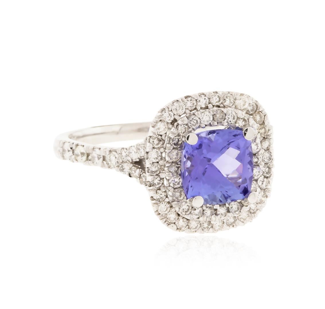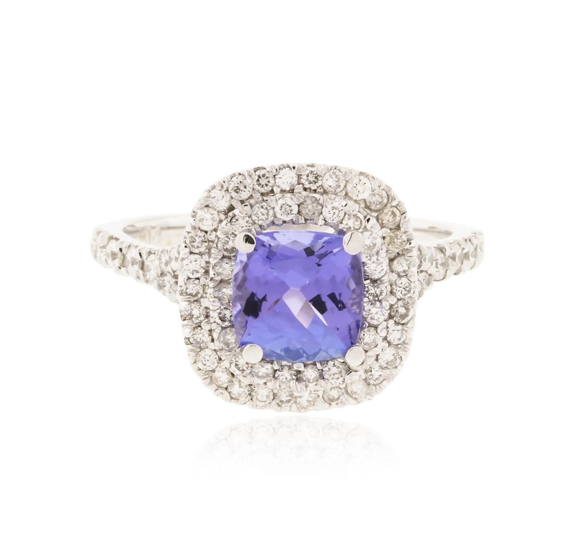 One electronically tested 14KT white gold ladies cast tanzanite and diamond ring with a bright polish finish. Identified with markings of "14K". Condition is new. Containing: One prong set square cushion modified brilliant cut natural tanzanite, measuring 6.00 x 6.00 x 3.90mm, approximate weight of 1.11ct., clarity is eye clean, type I, medium light, moderately strong, violet color, (GIA V 4/4), cut is good. Sixty-Four prong set round brilliant cut diamonds, measuring 1.50 - 1.30 x 0.84mm (depth est.) approximate total weight of 64 Stones = 0.64ct. Clarity: SI-1 to I-1. Color: I - J, Cut is Good. Colored gemstones are presumed to have been subjected to commonly used enhancement processes. All diamonds and colored gemstones are graded in the mounting, unless otherwise stated. Total Weight of Colored Stones 1.11ct. Total Weight of Diamonds 0.64ct. Total Weight of Ring 2.90 grams. GGL Appraised at $3,355.00.