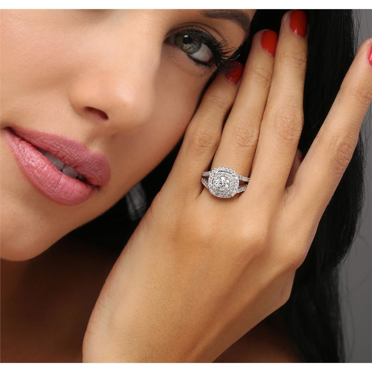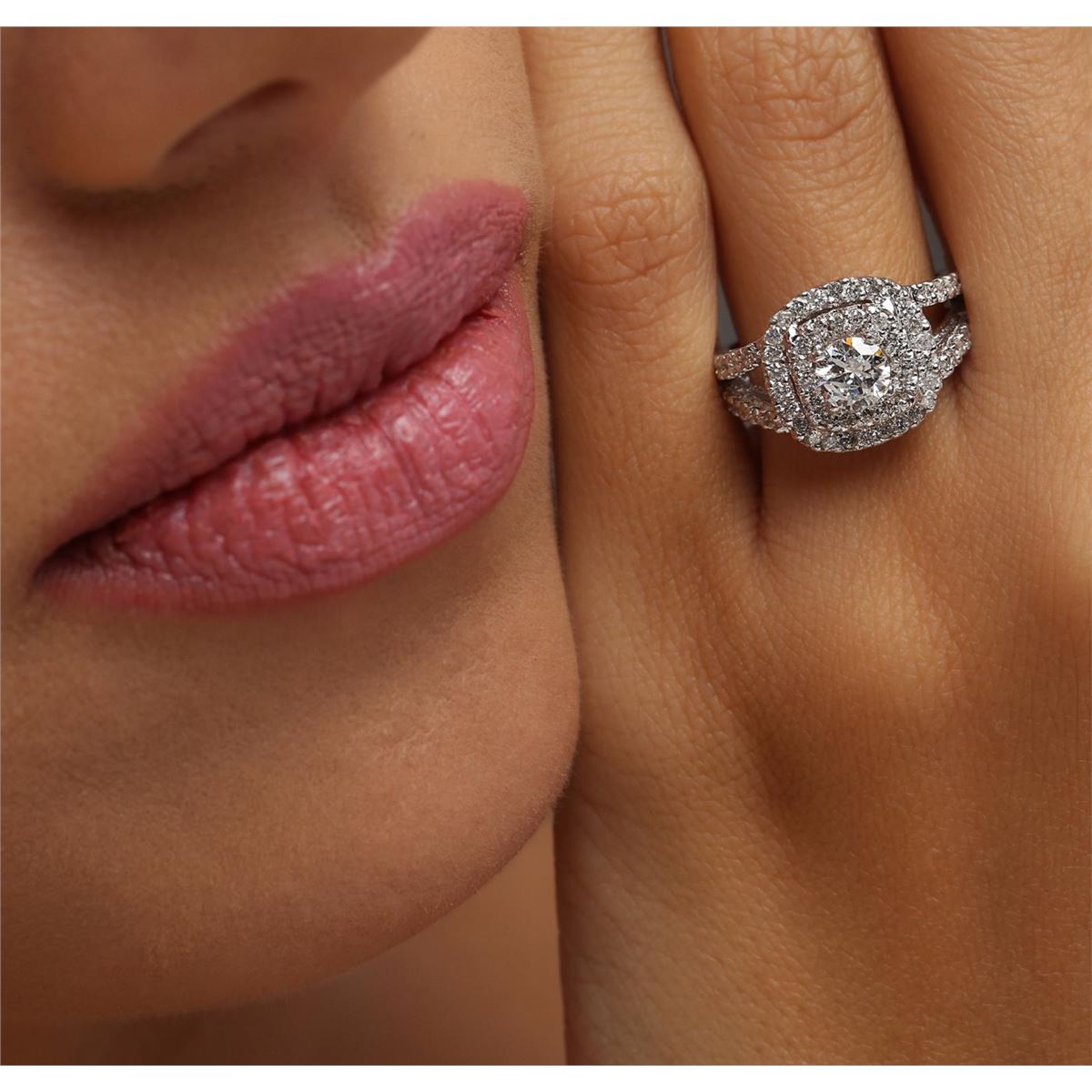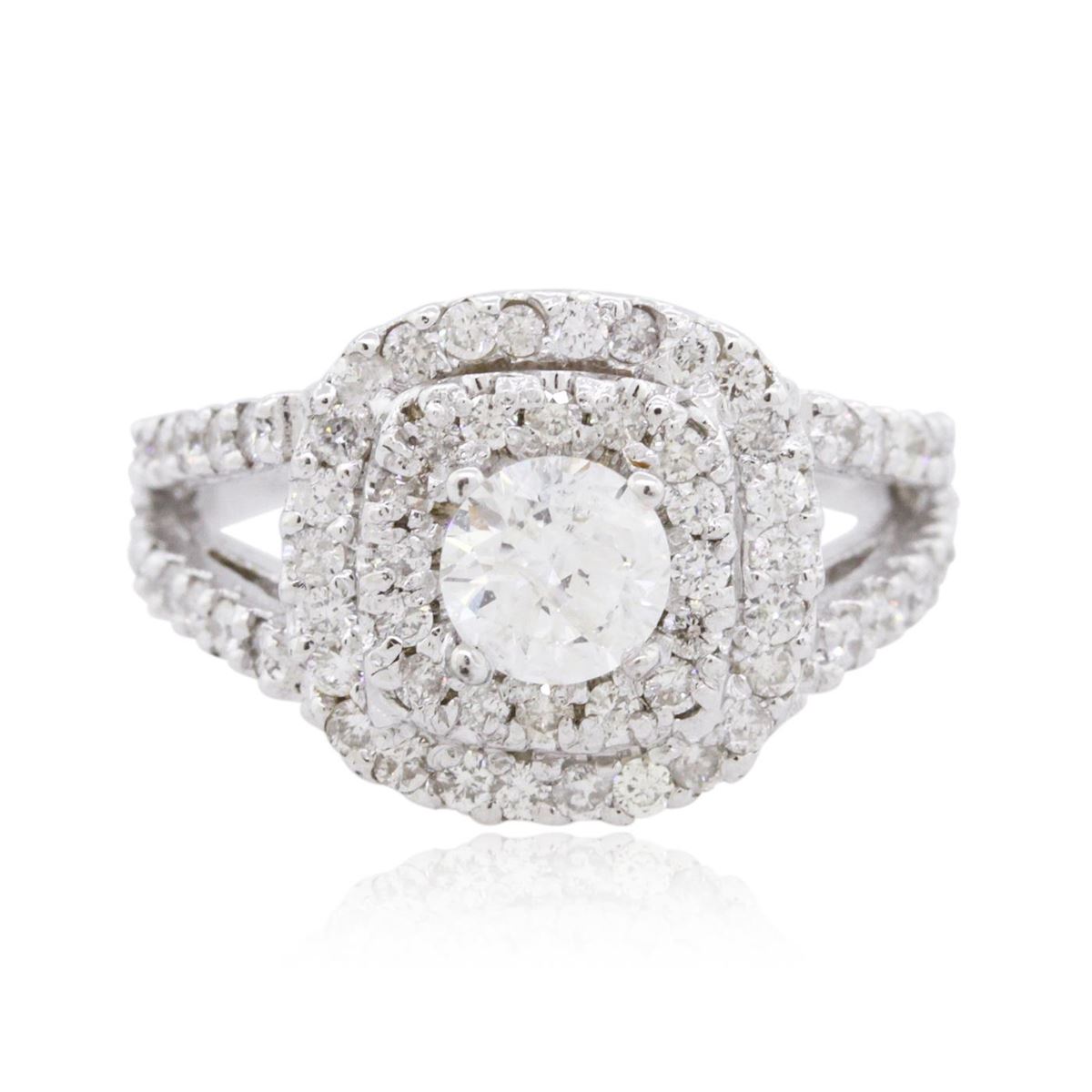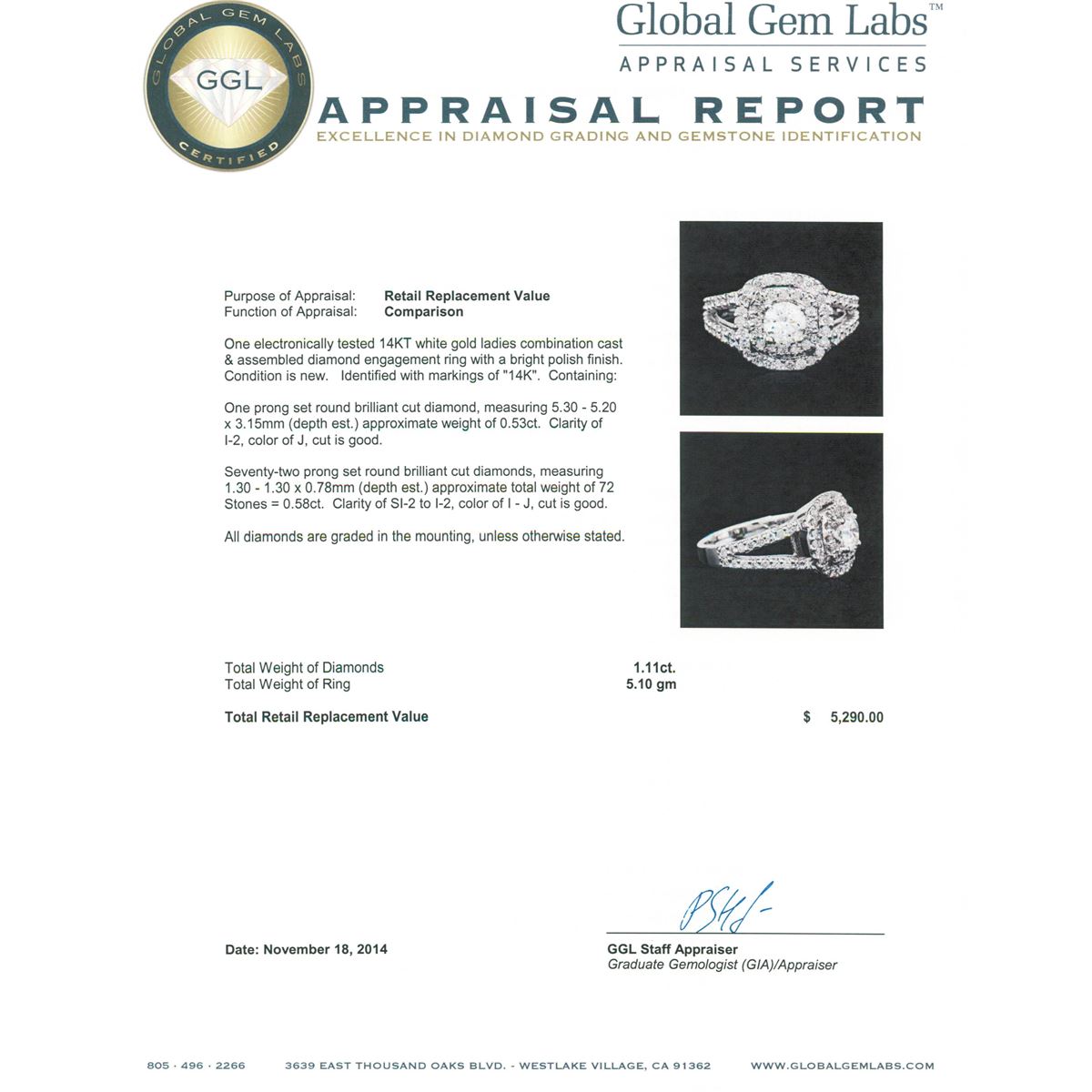 One electronically tested 14KT white gold ladies combination cast & assembled diamond engagement ring with a bright polish finish. Identified with markings of "14K". Condition is new. Containing: One prong set round brilliant cut diamond, measuring 5.30 - 5.20 x 3.15mm (depth est.) approximate weight of 0.53ct. Clarity: I-2. Color: J, Cut is Good. Seventy-Two prong set round brilliant cut diamonds, measuring 1.30 - 1.30 x 0.78mm (depth est.) approximate total weight of 72 Stones = 0.58ct. Clarity: SI-2 to I-2. Color: I - J, Cut is Good. All diamonds are graded in the mounting, unless otherwise stated. Total Weight of Diamonds 1.11ct. Total Weight of Ring 5.10 grams. GGL Appraised at $5,290.00.