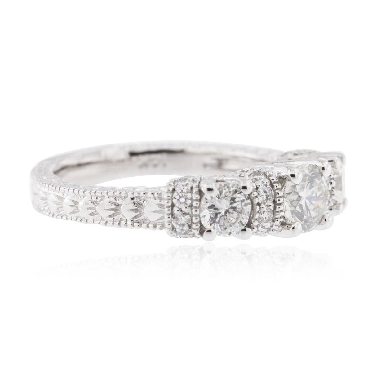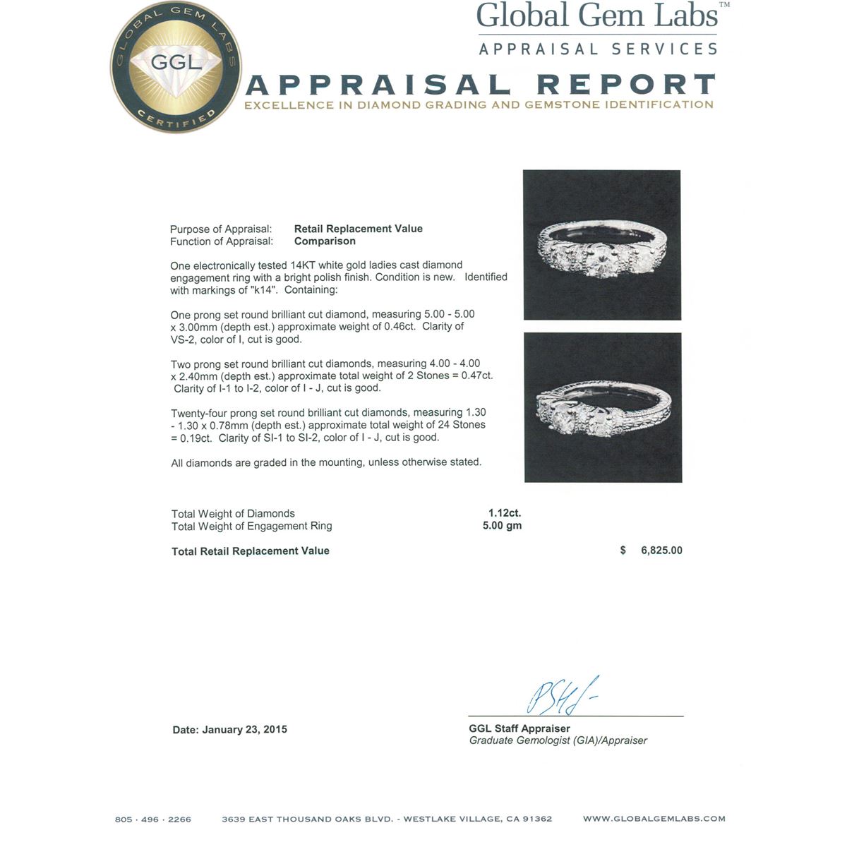 One electronically tested 14KT white gold ladies cast diamond engagement ring with a bright polish finish. Identified with markings of "k14". Condition is new. Containing: One prong set round brilliant cut diamond, measuring 5.00 - 5.00 x 3.00mm (depth est.) approximate weight of 0.46ct. Clarity: VS-2. Color: I, Cut is Good. Two prong set round brilliant cut diamonds, measuring 4.00 - 4.00 x 2.40mm (depth est.) approximate total weight of 2 Stones = 0.47ct. Clarity: I-1 to I-2. Color: I - J, Cut is Good. Twenty-Four prong set round brilliant cut diamonds, measuring 1.30 - 1.30 x 0.78mm (depth est.) approximate total weight of 24 Stones = 0.19ct. Clarity: SI-1 to SI-2. Color: I - J, Cut is Good. All diamonds are graded in the mounting, unless otherwise stated. Total Weight of Diamonds 1.12ct. Total Weight of Engagement Ring 5.00 grams. GGL Appraised at $6,825.00.
