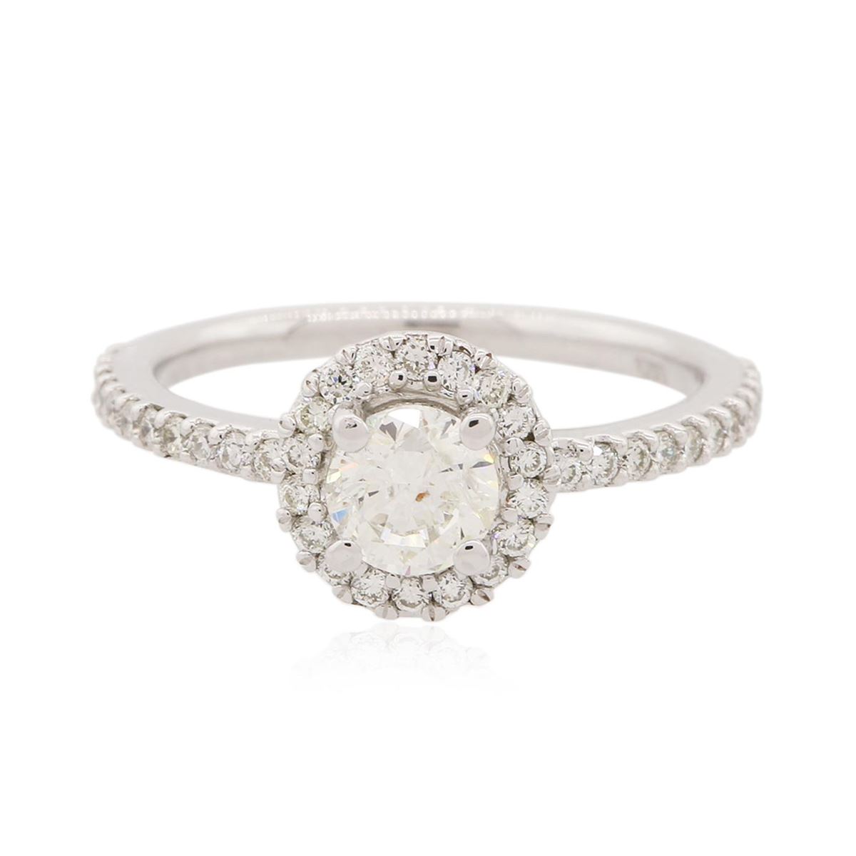 One electronically tested 14KT white gold Ladies combination cast & assembled engagement ring with a bright polish finish. Condition is new. Identified with markings of "14K". Containing: One prong set round brilliant cut diamond, measuring 5.40 - 5.40 x 4.50mm (depth est.) approximate weight of 0.80ct. Clarity: SI-2. Color: M, Cut is Good. Forty prong set round brilliant cut diamonds, measuring 1.30 - 1.30 x 0.78mm (depth est.) approximate. Total Weight of 40 Stones = 0.32ct. Clarity: SI-2 to I-1. Color: J - K, Cut is Very Good. Diamonds graded in the mounting. Total Weight of Diamonds 1.12ct. Total Weight of Ring 2.70 grams. GGL Appraised at $6,430.00.