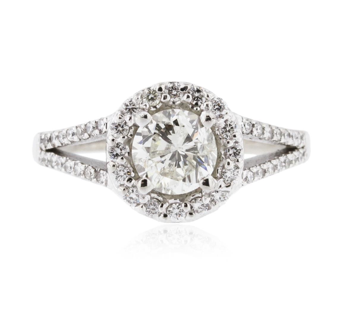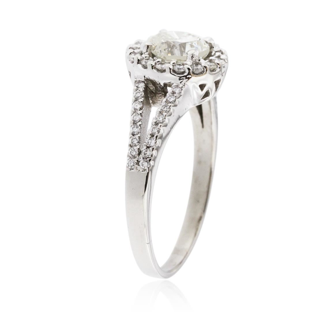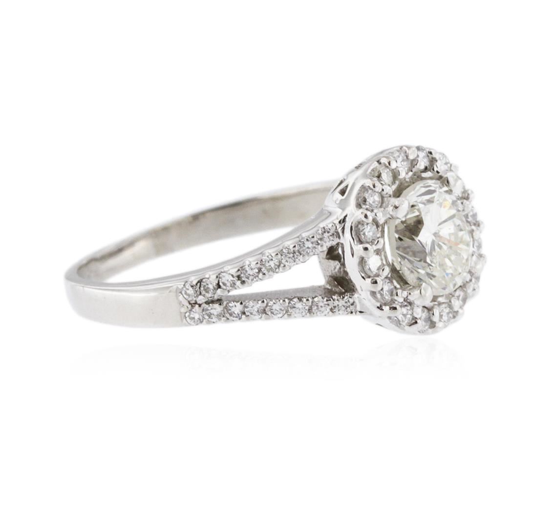 One electronically tested 14KT white gold ladies cast diamond engagement ring with a bright polish finish. Condition is new. Containing: One prong set round brilliant cut diamond, measuring 5.90 - 5.90 x 3.54mm (depth est.) approximate weight of 0.75ct. Clarity: SI-2. Color: M, Cut is Good. Forty-Six prong set round brilliant cut diamonds, measuring 1.50 - 1.10 x 0.78mm (depth est.) approximate total weight of 46 Stones = 0.37ct. Clarity: SI-1 to I-1. Color: J, Cut is Good. All diamonds are graded in the mounting, unless otherwise stated. Total Weight of Diamonds 1.12ct. Total Weight of Engagement Ring 5.70 grams. GGL Appraised at $5,395.00.