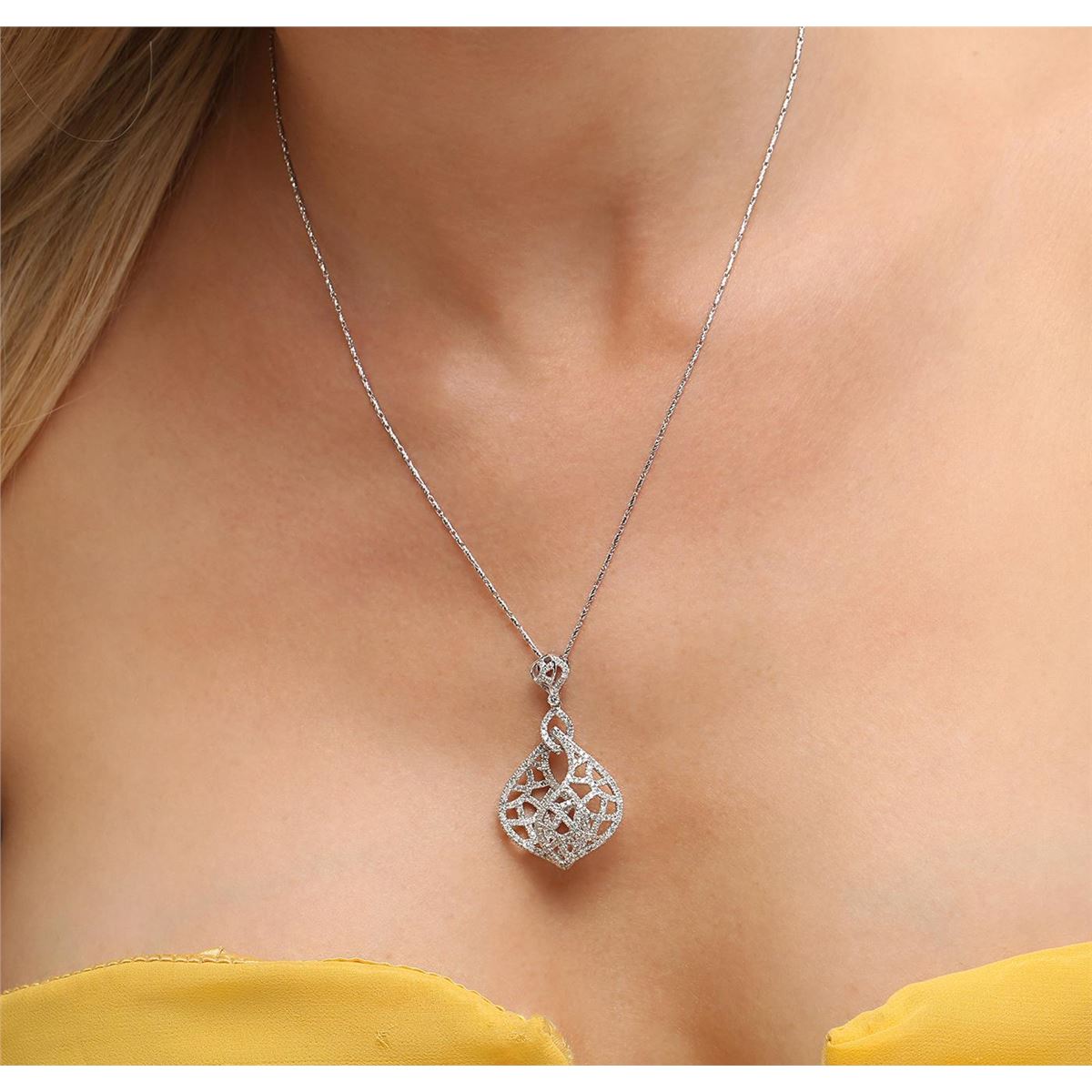 One electronically tested 14KT white gold ladies cast diamond necklace with a spring ring clasp with a bright polish finish. Measurements: 16" in length Identified with markings of "585". Condition is new. Containing: Two Hundred Thirty-Three prong set round brilliant cut diamonds, measuring 1.10 - 1.10 x 0.66mm (depth est.) approximate total weight of 233 Stones = 1.12ct. Clarity: SI-1 to I-1. Color: H - I, Cut is Good. All diamonds are graded in the mounting, unless otherwise stated. Total Weight of Diamonds 1.12ct. Total Weight of Necklace 10.00 grams. GGL Appraised at $5,550.00.