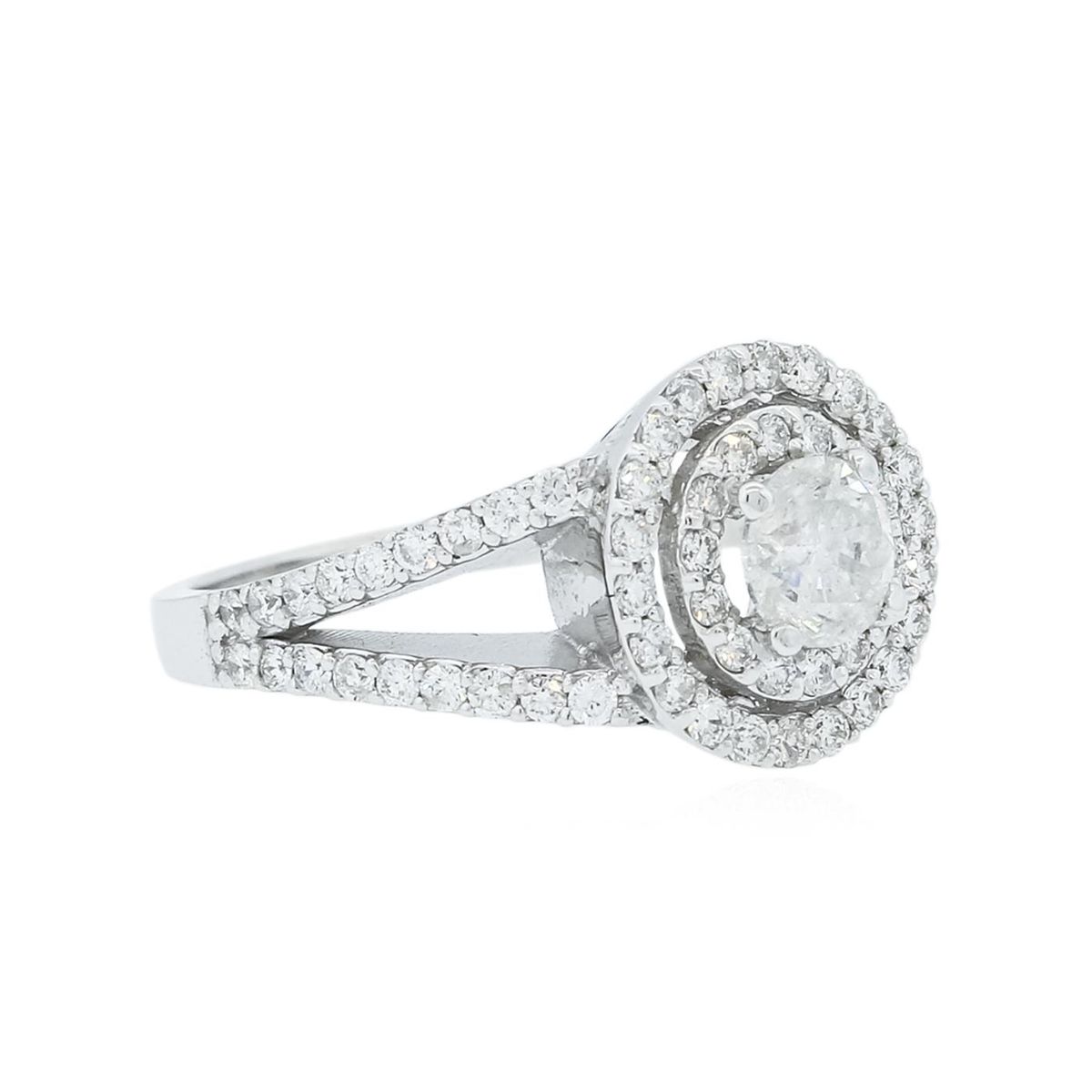 One electronically tested 14KT white gold ladies cast diamond engagement ring with a bright polish finish. Identified with markings of "K14". Condition is new. Containing: One prong set round brilliant cut diamond, measuring 5.30 - 5.30 x 3.18mm (depth est.) approximate weight of 0.55ct. Clarity: I-2. Color: J, Cut is Good. Seventy-Two prong set round brilliant cut diamonds, measuring 1.30 - 1.30 x 0.78mm (depth est.) approximate total weight of 72 Stones = 0.58ct. Clarity: SI-2 to I-1. Color: H, Cut is Good. All diamonds are graded in the mounting, unless otherwise stated. Total Weight of Diamonds 1.12ct. Total Weight of Ring 5.00 grams. GGL Appraised at $5,595.00.