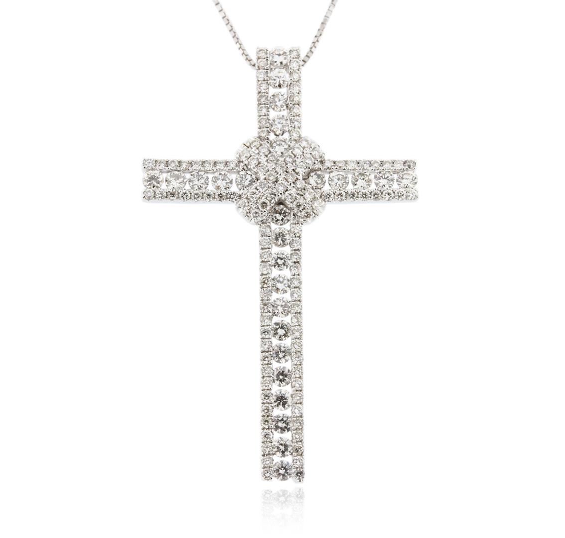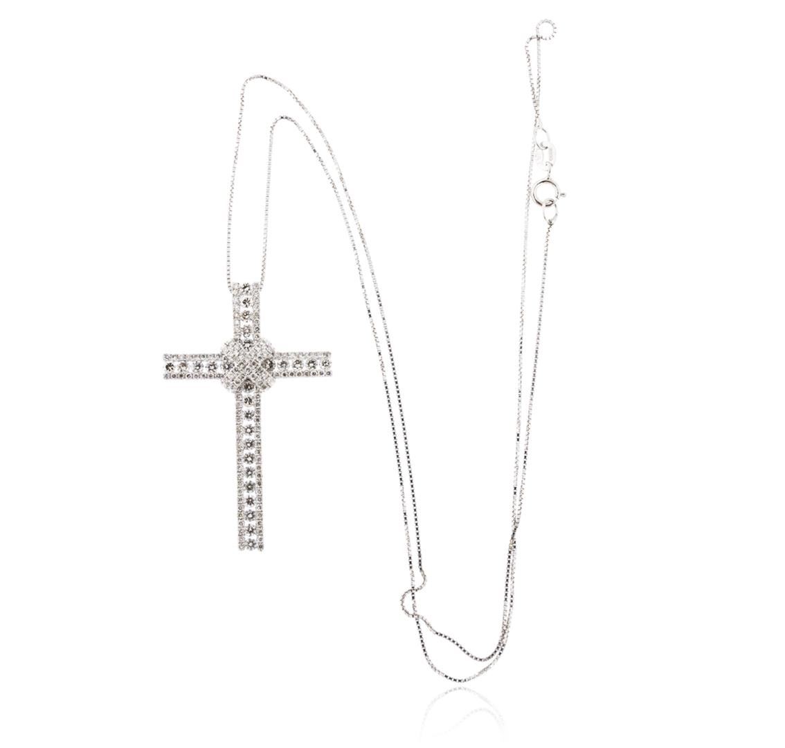 One electronically tested 14KT white gold unisex combination cast & assembled diamond cross pendant & chain 18.0" long, thin square box link with a spring ring clasp with a bright polish finish. Identified with markings of "14K 585". Condition is new. Containing: Twenty-Seven channel set round brilliant cut diamonds, measuring 1.80 - 1.80 x 1.08mm (depth est.) approximate total weight of 27 Stones = 0.58ct. Clarity: SI-1 to SI-2. Color: H - I, Cut is Good. One Hundred Sixteen prong set round brilliant cut diamonds, measuring 1.10 - 1.10 x 0.66mm (depth est.) approximate total weight of 116 Stones = 0.56ct. Clarity: SI-2 to I-1. Color: H - I, Cut is Good. All diamonds are graded in the mounting, unless otherwise stated. Total Weight of Diamonds 1.13ct. Total Weight of Pendant & Chain 4.80 grams. GGL Appraised at $4,920.00.