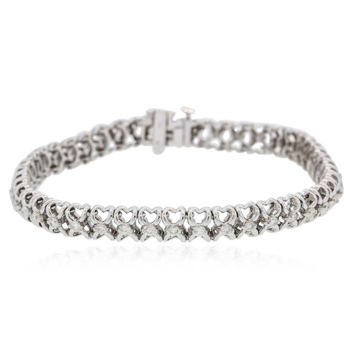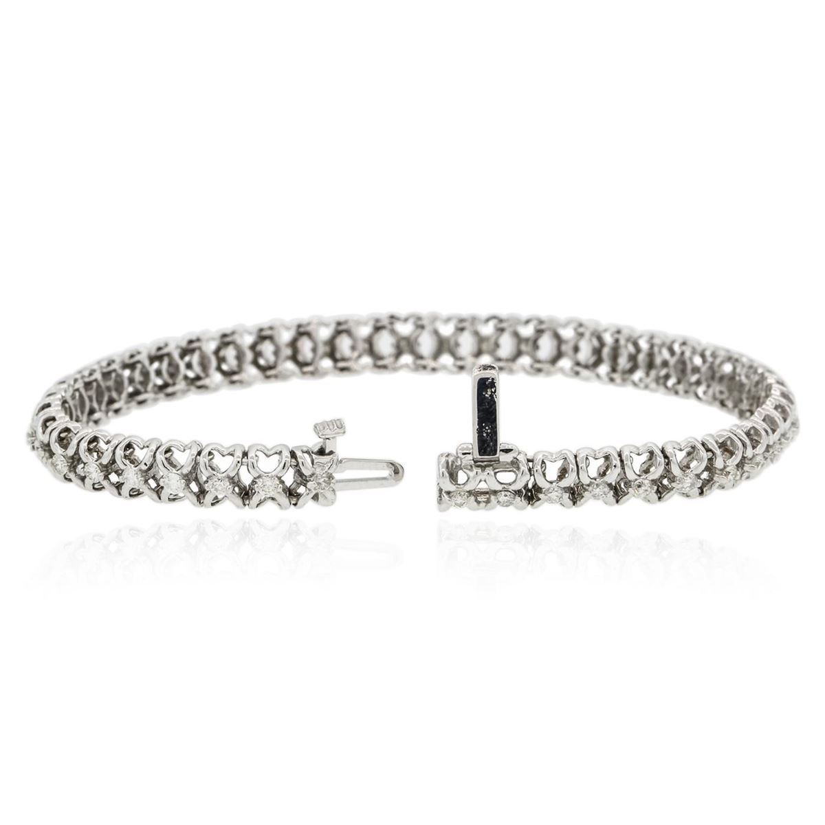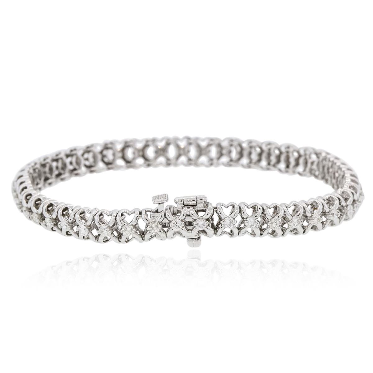 One electronically tested 14KT white gold ladies combination cast & assembled tennis bracelet with a hidden box clasp with a bright polish finish. Condition is new. Measurements: 6.75" in length. Containing: Forty-Five prong set round brilliant cut diamonds, measuring 1.90 - 1.90 x 1.14mm (depth est.) approximate total weight of 45 Stones = 1.13ct. Clarity: SI-1 to I-1. Color: G - I, Cut is Good. All diamonds are graded in the mounting, unless otherwise stated. Total Weight of Diamonds 1.13ct. Total Weight of Bracelet 11.40 grams. GGL Appraised at $6,730.00.