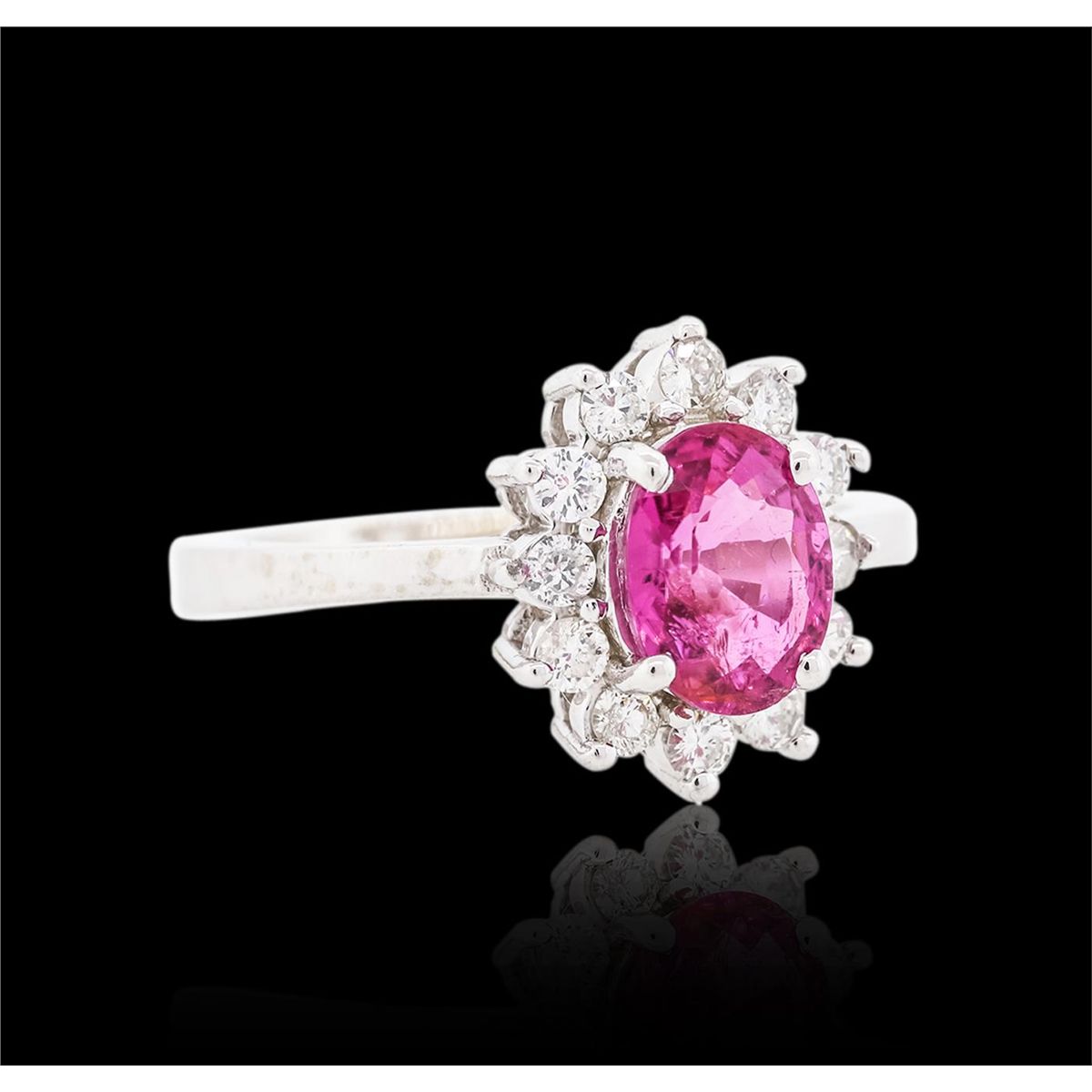 One electronically tested 14KT white gold ladies cast pink tourmaline and diamond ring with a bright polish finish. The featured pink tourmaline is set within a diamond bezel, completed by a two and one-half millimeter wide band. Identified with markings of "14K". Condition is new, good workmanship. Containing: One prong set oval mixed cut natural pink tourmaline, measuring 7.65 x 5.75 x 4.10mm, approximate weight of 1.13ct., clarity is slightly included, dark, moderately strong, pink color, (GIA Pk 7/4), cut is good. Transmitting light with a minimum of distortion, transparent. Naturally occurring internal & external characteristics are present. Graded in the setting. This color of tourmaline is commonly irradiated to improve or change the color. Whether or not this gemstone has been irradiated cannot currently be determined. Twelve prong set round brilliant cut diamonds, measuring 2.00 - 2.00 x 1.20mm (depth est.) approximate total weight of 12 Stones = 0.45ct. Graded in the setting. Clarity SI-1 to I-1. Color G - I. Total Weight of Colored Stones 1.13ct. Total Weight of Diamonds 0.45ct. Total Weight of Ring 3.89 grams. AIG Appraised at $2,255.00.