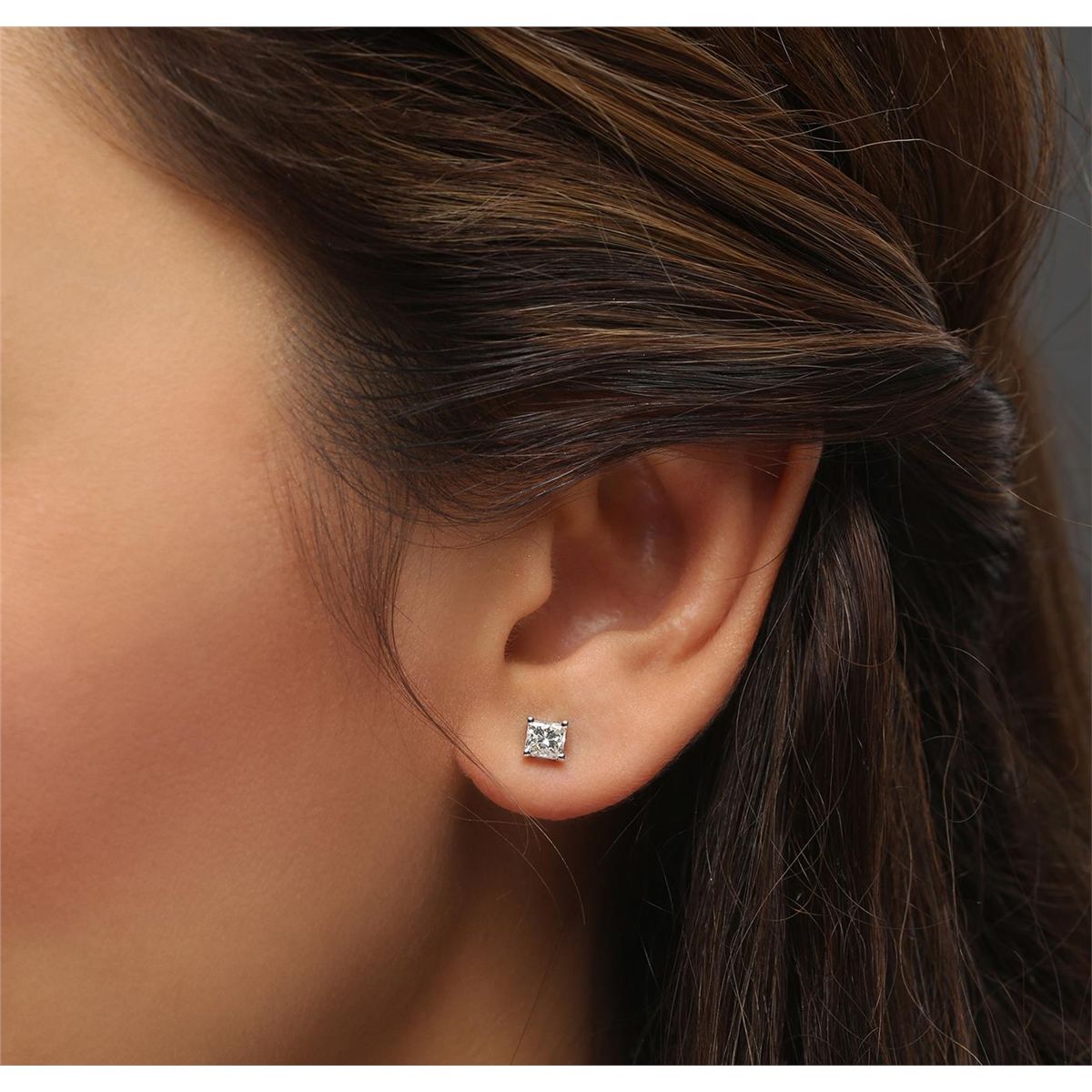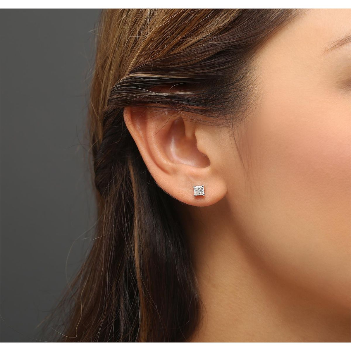 One pair electronically tested 14KT white gold cast & assembled diamond solitaire earrings with screw backs. Bright polish finish. Condition is new, good workmanship. Containing: One prong set princess cut diamond, measuring 4.30 x 4.00 x 3.50mm (depth est.) approximate weight of 0.59ct. Graded in the setting. Clarity: I-1. Color: K. Depth 87.5%. Table 85.0%. One prong set princess cut diamond, measuring 4.30 x 4.05 x 3.10mm (depth est.) approximate weight of 0.54ct with a medium blue fluorescence. Graded in the setting. Clarity: I-1. Color: J. Depth 76.5%. Table 81.5%. Total Weight of Diamonds 1.13ct. Total Weight of Earrings 1.02 grams. AIG Appraised at $3,215.00.
