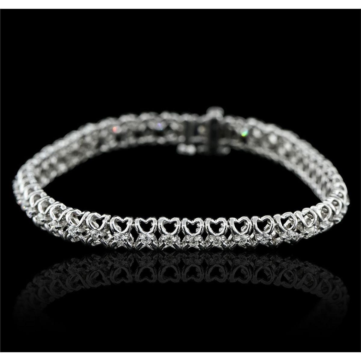 One electronically tested 14KT white gold ladies combination cast & assembled tennis bracelet with a hidden box clasp with a bright polish finish. Condition is new. Measurements: 6.75" in length. Containing: Forty-Five prong set round brilliant cut diamonds, measuring 1.90 - 1.90 x 1.14mm (depth est.) approximate total weight of 45 Stones = 1.13ct. Clarity: SI-1 to I-1. Color: G - I, Cut is Good. All diamonds are graded in the mounting, unless otherwise stated. Total Weight of Diamonds 1.13ct. Total Weight of Bracelet 11.40 grams. GGL Appraised at $6,730.00.