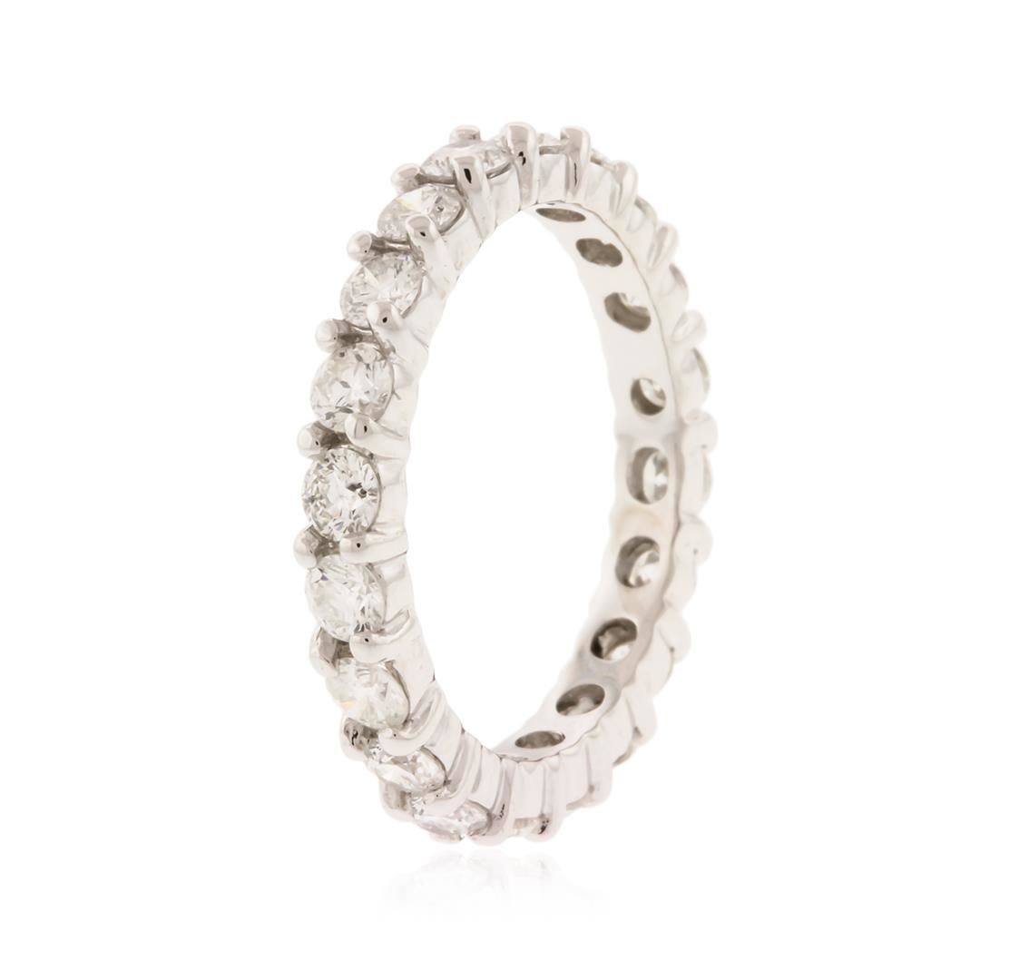 One electronically tested 14KT white gold ladies cast diamond eternity ring with a bright polish finish. Identified with markings of "14K". Condition is new. Containing: Twenty prong set round brilliant cut diamonds, measuring 2.50 - 2.50 x 1.50mm (depth est.) approximate total weight of 20 Stones = 1.14ct. Clarity: SI-1 to I-1. Color: I - J, Cut is Good. All diamonds are graded in the mounting, unless otherwise stated. Total Weight of Diamonds 1.14ct. Total Weight of Eternity Ring 2.70 grams. GGL Appraised at $3,050.00.