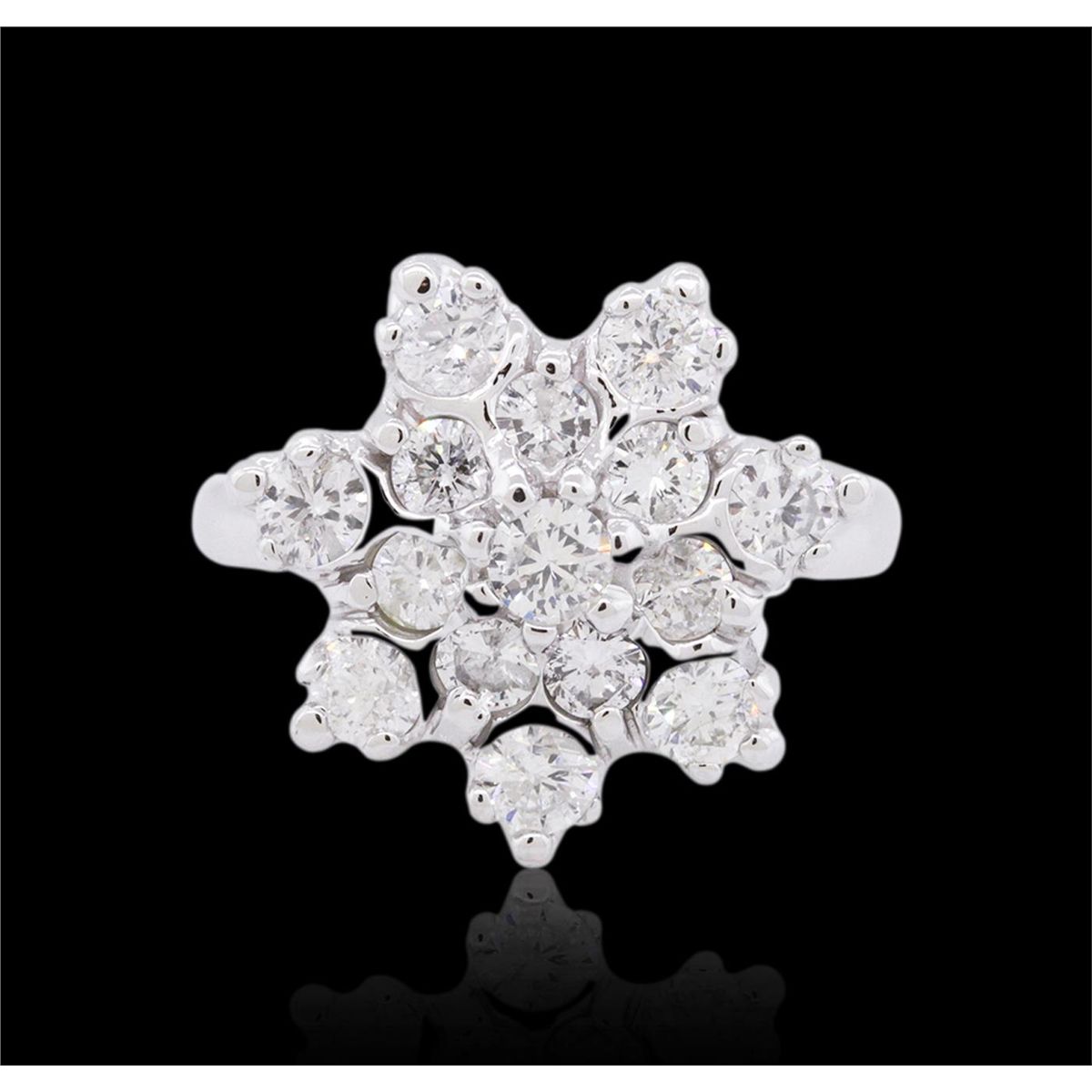 One electronically tested 14KT white gold ladies combination cast & die struck diamond ring with a flat shank with a bright polish finish. Identified with markings of "14K". Condition is new. Containing: Fifteen prong set round brilliant cut diamonds, measuring 3.00 - 2.50 x 1.65mm (depth est.) approximate total weight of 15 Stones = 1.14ct. Clarity: SI-2 to I-1. Color: J, Cut is Good. All diamonds are graded in the mounting, unless otherwise stated. Total Weight of Diamonds 1.14ct. Total Weight of Ring 5.90 grams. GGL Appraised at $4,570.00.