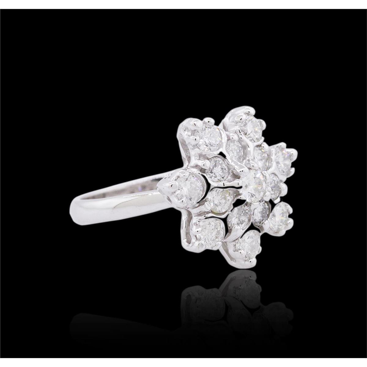 One electronically tested 14KT white gold ladies combination cast & die struck diamond ring with a flat shank with a bright polish finish. Identified with markings of "14K". Condition is new. Containing: Fifteen prong set round brilliant cut diamonds, measuring 3.00 - 2.50 x 1.65mm (depth est.) approximate total weight of 15 Stones = 1.14ct. Clarity: SI-2 to I-1. Color: J, Cut is Good. All diamonds are graded in the mounting, unless otherwise stated. Total Weight of Diamonds 1.14ct. Total Weight of Ring 5.90 grams. GGL Appraised at $4,570.00.