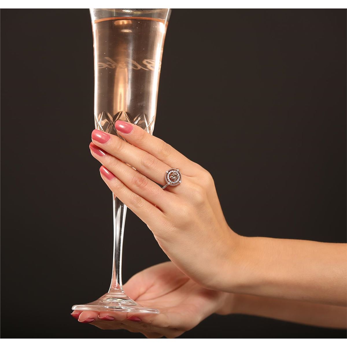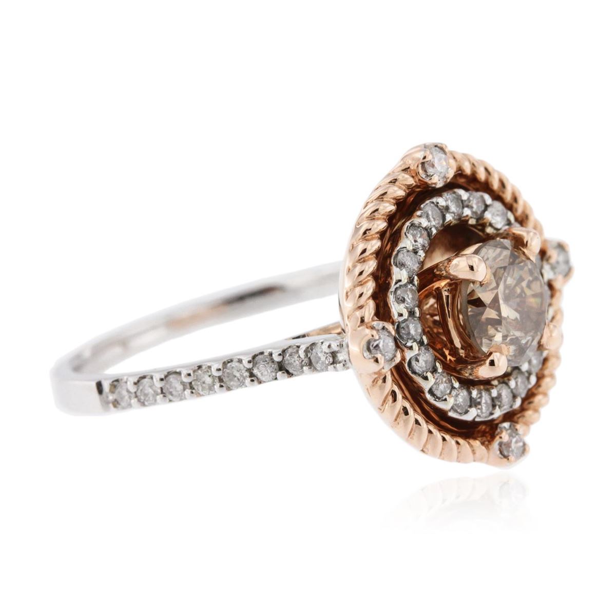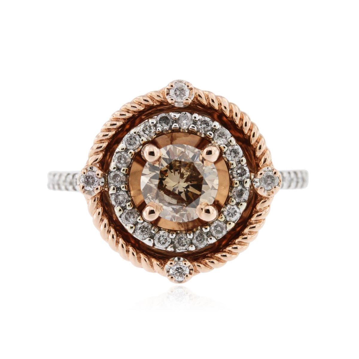 One electronically tested 14KT white gold ladies cast & assembled diamond ring. Condition is new, good workmanship. The featured diamond is set within a diamond bezel, mounted in a rose gold basket, supported by diamond set shoulders and completed by a one and one-half millimeter wide band. Trademark is PMI. Identified with markings of "14K". Containing: One prong set round brilliant cut diamond, measuring 5.75 - 5.70 x 3.44mm (depth est.) approximate weight of 0.73ct. with a strong blue florescence. Graded in the setting. Clarity I-1. Color Fancy Light Brown. Depth 60.0%. Table 61.1%. Thirty-seven prong set round brilliant cut diamonds, measuring 1.40 - 1.30 x 0.81mm (depth est.) approximate total weight of 37 Stones = 0.41ct. Graded in the setting. Clarity I-1 to I-3. Color G - I. Total Weight of Diamonds 1.14ct. Total Weight of Ring 4.80 gm. AIG Appraised at $6,210.00.