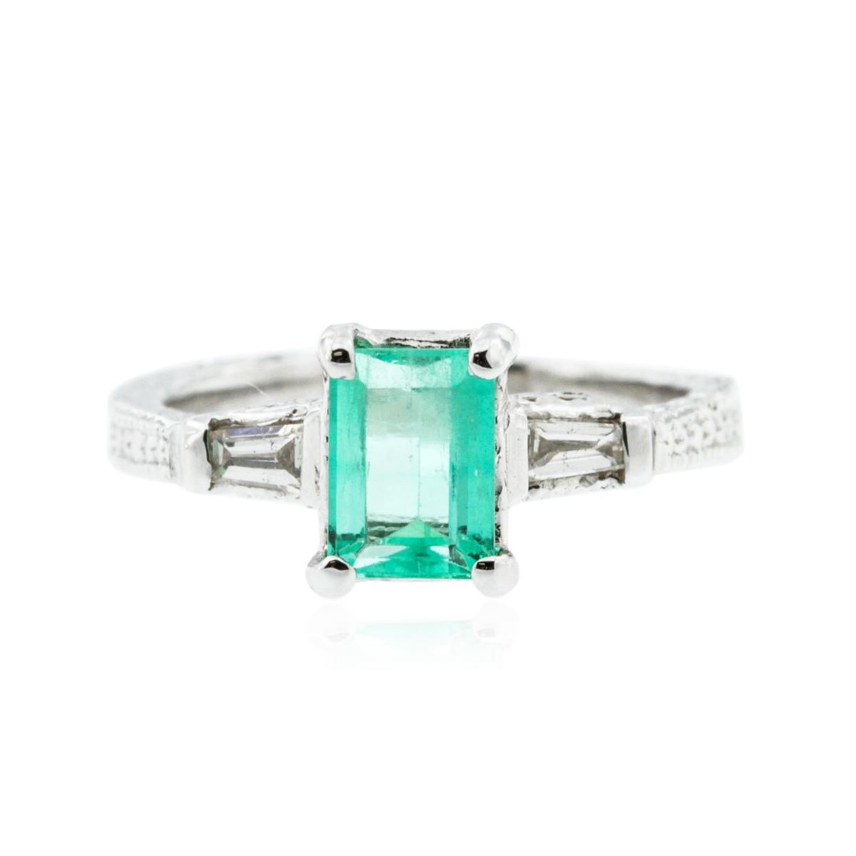 One ring featuring: 14KT white gold weighing 3.50 grams containing one emerald center stone with a total weight of 1.15ct and two baguette cut diamonds with a total weight of 0.21ct.