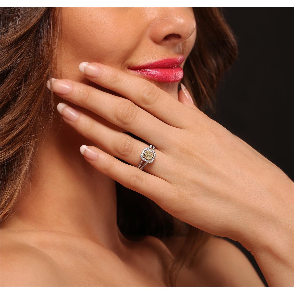 One electronically tested 14KT white gold ladies cast diamond unity ring. Condition is new, good workmanship. The featured diamond is set within a diamond bezel supported by a diamond set under gallery and diamond set split shoulders, completed by a two and one-half millimeter wide band. Bright polish finish with yellow gold accents. Trademark is DAYANII. Identified with markings of "14K 585". Containing: One prong set cushion cut diamond, measuring 5.75 x 5.15 x 3.90mm (depth est.) approximate weight of 1.15ct with a faint blue fluorescence. Graded in the setting. Clarity SI-1 Depth 75.7%Table 56.3% Seventy-Six prong set round brilliant cut diamonds, measuring 1.20 - 1.00 x 0.66mm (depth est.) approximate total weight of 76 Stones = 0.46ct. Graded in the setting. Clarity SI-1 to I-1 Color G - I Total Weight of Diamonds 1.61ct. Total Weight of Ring 4.16 grams. AIG Appraised at $11,040.00.