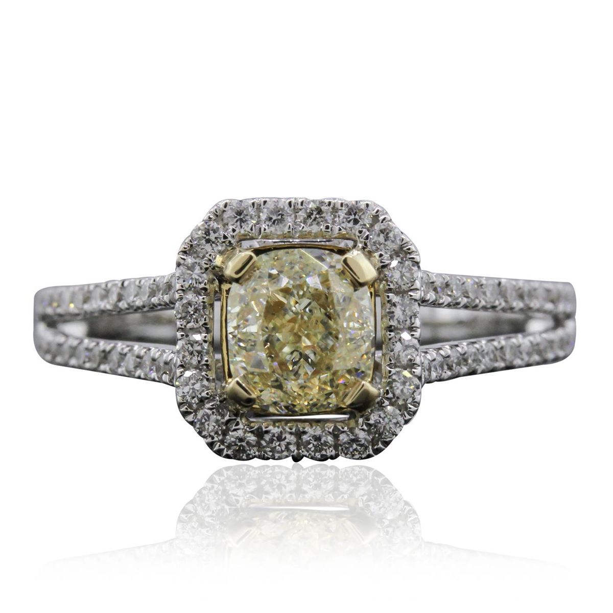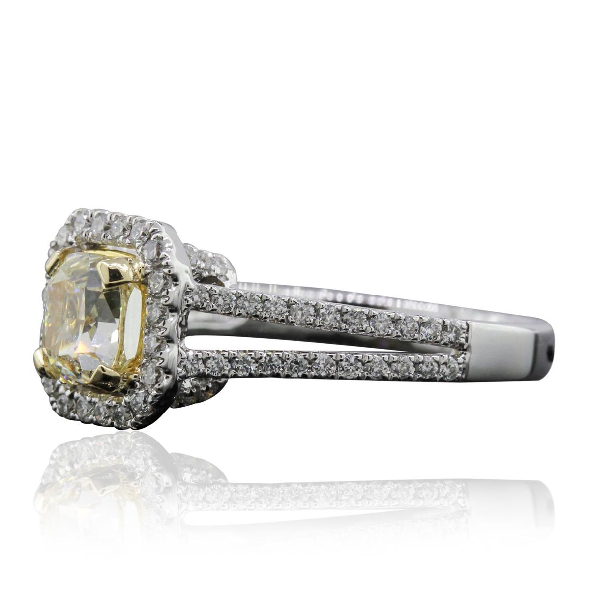 One electronically tested 14KT white gold ladies cast diamond unity ring. Condition is new, good workmanship. The featured diamond is set within a diamond bezel supported by a diamond set under gallery and diamond set split shoulders, completed by a two and one-half millimeter wide band. Bright polish finish with yellow gold accents. Trademark is DAYANII. Identified with markings of "14K 585". Containing: One prong set cushion cut diamond, measuring 5.75 x 5.15 x 3.90mm (depth est.) approximate weight of 1.15ct with a faint blue fluorescence. Graded in the setting. Clarity SI-1 Depth 75.7%Table 56.3% Seventy-Six prong set round brilliant cut diamonds, measuring 1.20 - 1.00 x 0.66mm (depth est.) approximate total weight of 76 Stones = 0.46ct. Graded in the setting. Clarity SI-1 to I-1 Color G - I Total Weight of Diamonds 1.61ct. Total Weight of Ring 4.16 grams. AIG Appraised at $11,040.00.