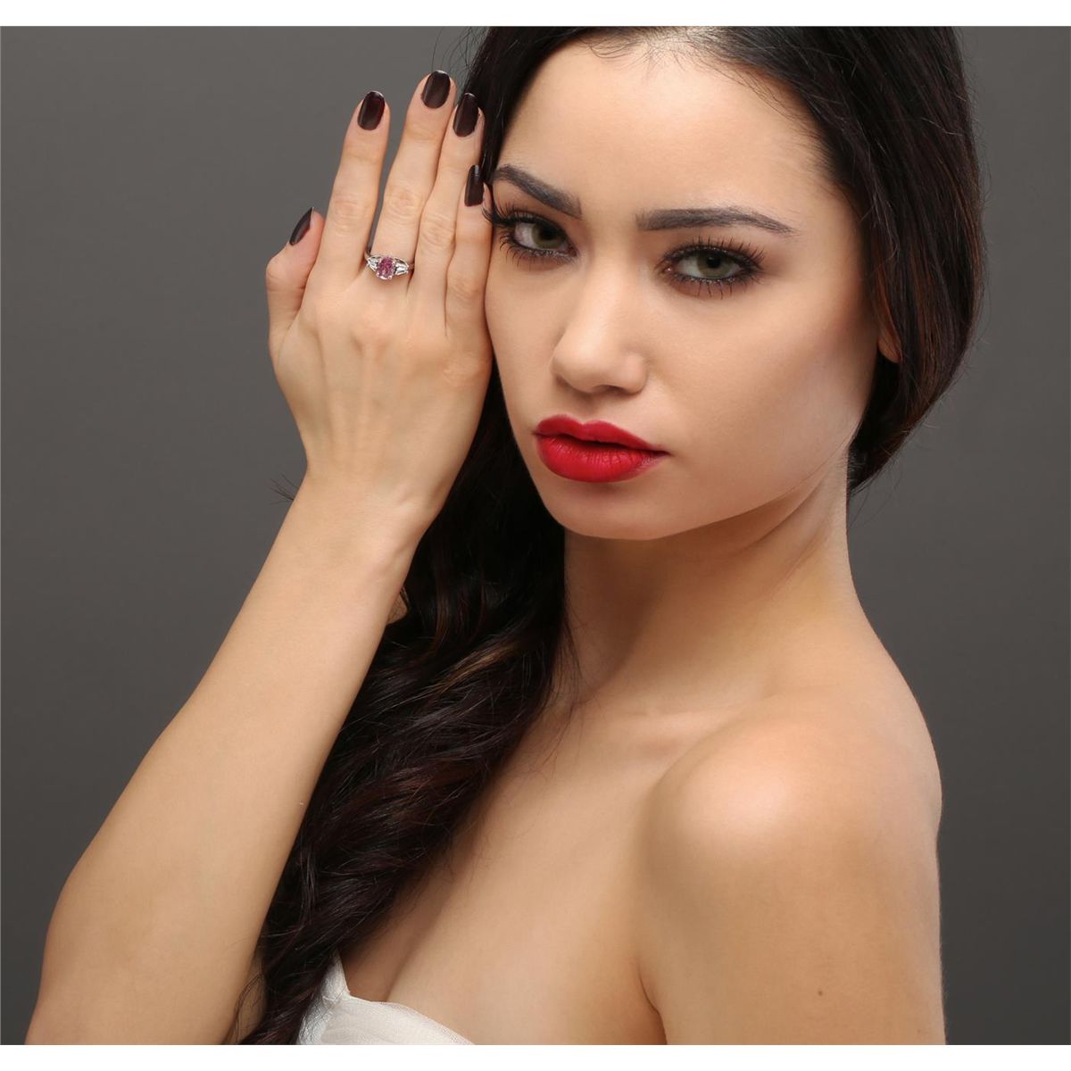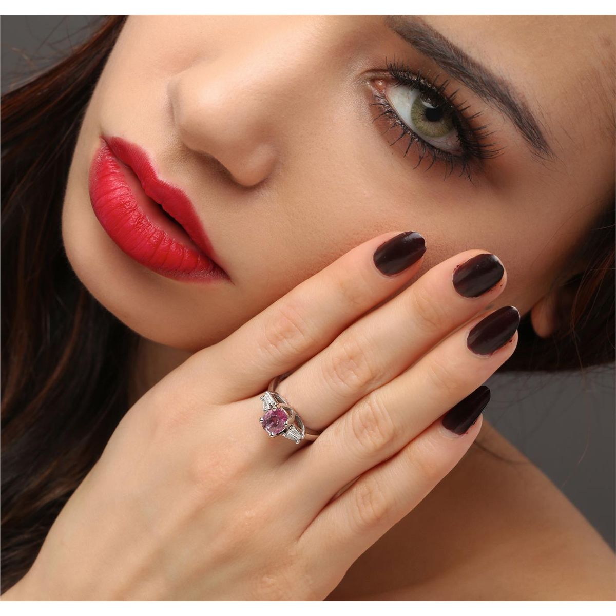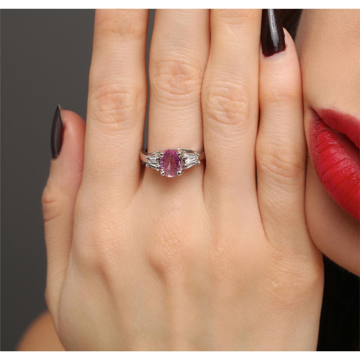 One ring featuring: 14KT white gold weighing 4.90 grams containing one pink sapphire center stone with a total weight of 1.15ct and baguette cut diamonds with a total weight of 0.40ct.