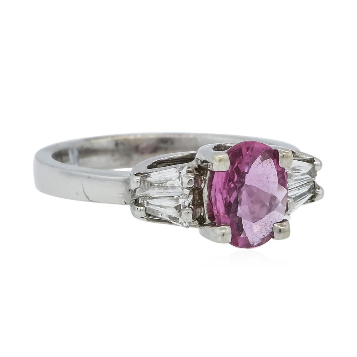One ring featuring: 14KT white gold weighing 4.90 grams containing one pink sapphire center stone with a total weight of 1.15ct and baguette cut diamonds with a total weight of 0.40ct.