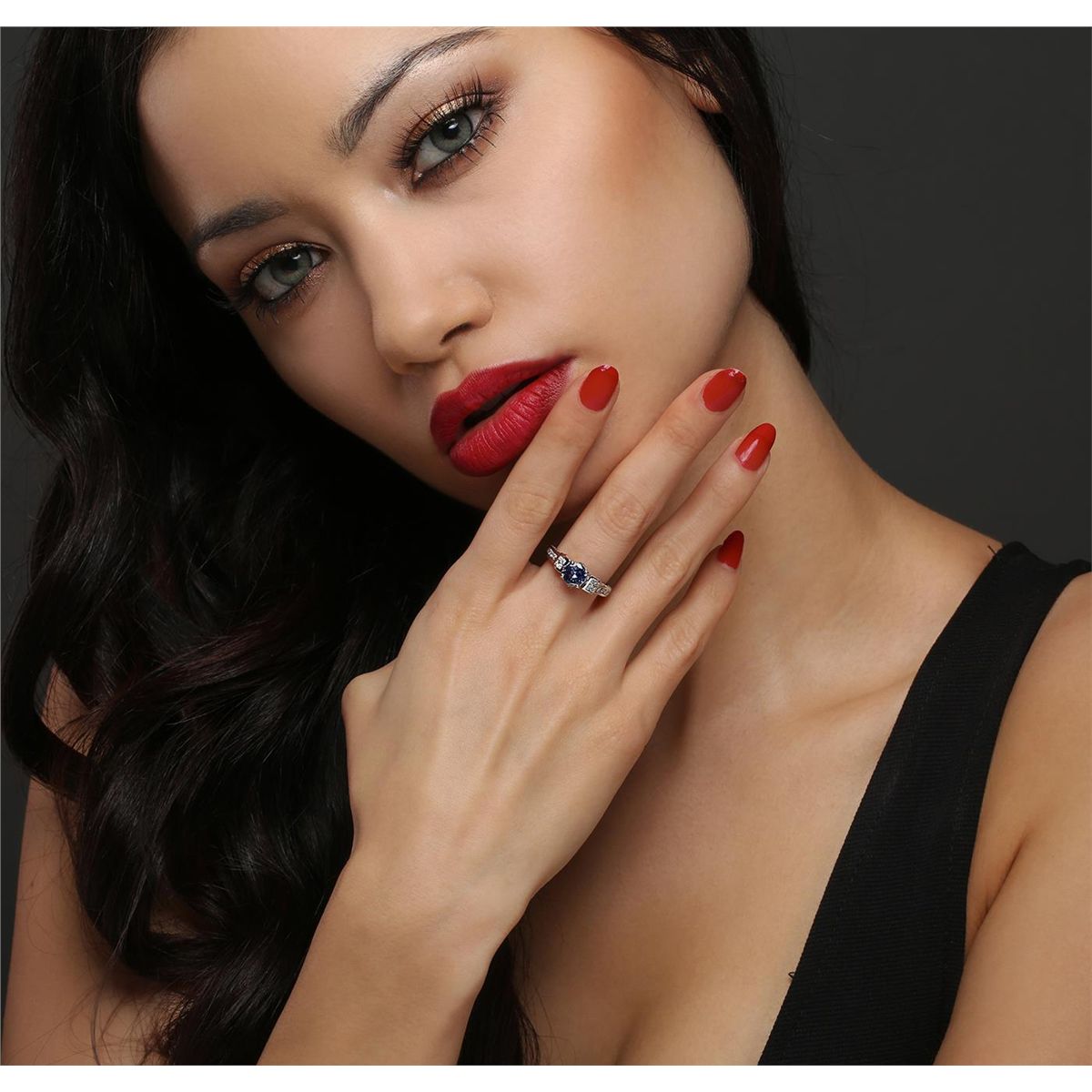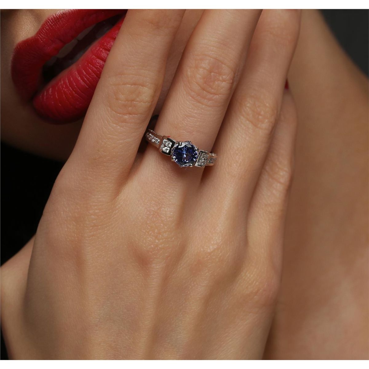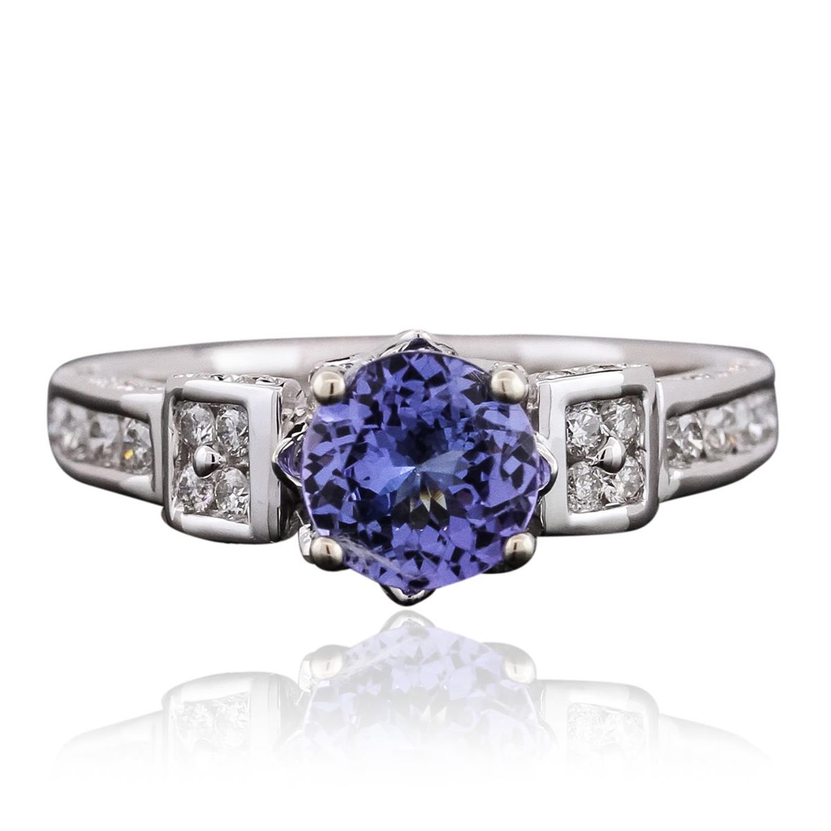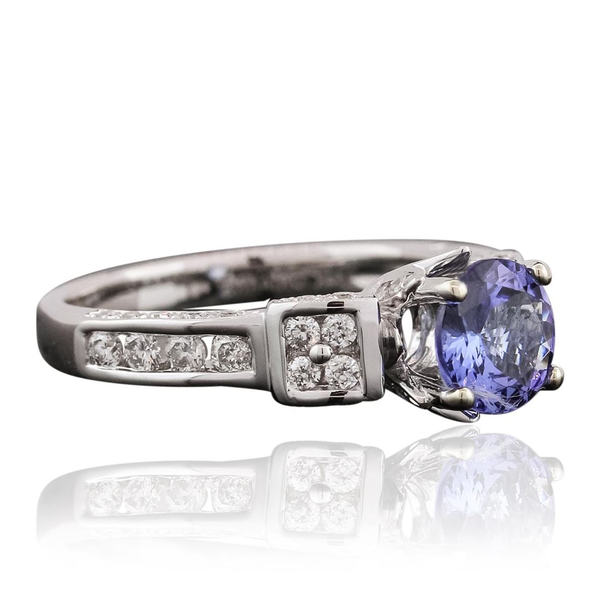 One electronically tested 14KT white gold ladies cast tanzanite and diamond ring with a bright polish finish. The featured tanzanite is supported by diamond set shoulders, completed by a two and one-half millimeter wide band. Trademark is Orianne. Identified with markings of "14KT". Condition is new, good workmanship. Containing: One prong set round brilliant cut natural tanzanite, measuring 6.65 - 6.60 x 3.65 mm, 6% bulge factor, approximate weight of 1.15ct., clarity is eye clean, type I, medium dark, very slightly grayish, bluish violet color, (GIA bV 6/3), cut is good. Transmitting light with no distortion, transparent. Graded in the setting. Tanzanite is a very rare gemstone that is only found in the country of Tanzania. Originally discovered in 1967. Tiffany & Company, named the stone Tanzanite. It is found in the Usumburu Mountains that border the Umba Valley of northern Tanzania. Tanzanite occurs in gray, brown, violet, blue, reddish-purple, & green. The gem is interesting because of its exceptional pleochroism. Rotated in different directions a tanzanite will exhibit multiple changes of color. Tanzanite has a low tolerance to ultrasonic cleaning, and should not be cleaned using this method. Sixty-Eight prong and channel set round brilliant and single cut cut diamonds approximate total weight of 68 Stones = 0.74ct. Graded in the setting. Clarity: SI-1 to I-1. Color: G - I. Total Weight of Colored Stones 1.15ct. Total Weight of Diamonds 0.74ct. Total Weight of Ring 4.18 grams. AIG Appraised at $4,890.00.