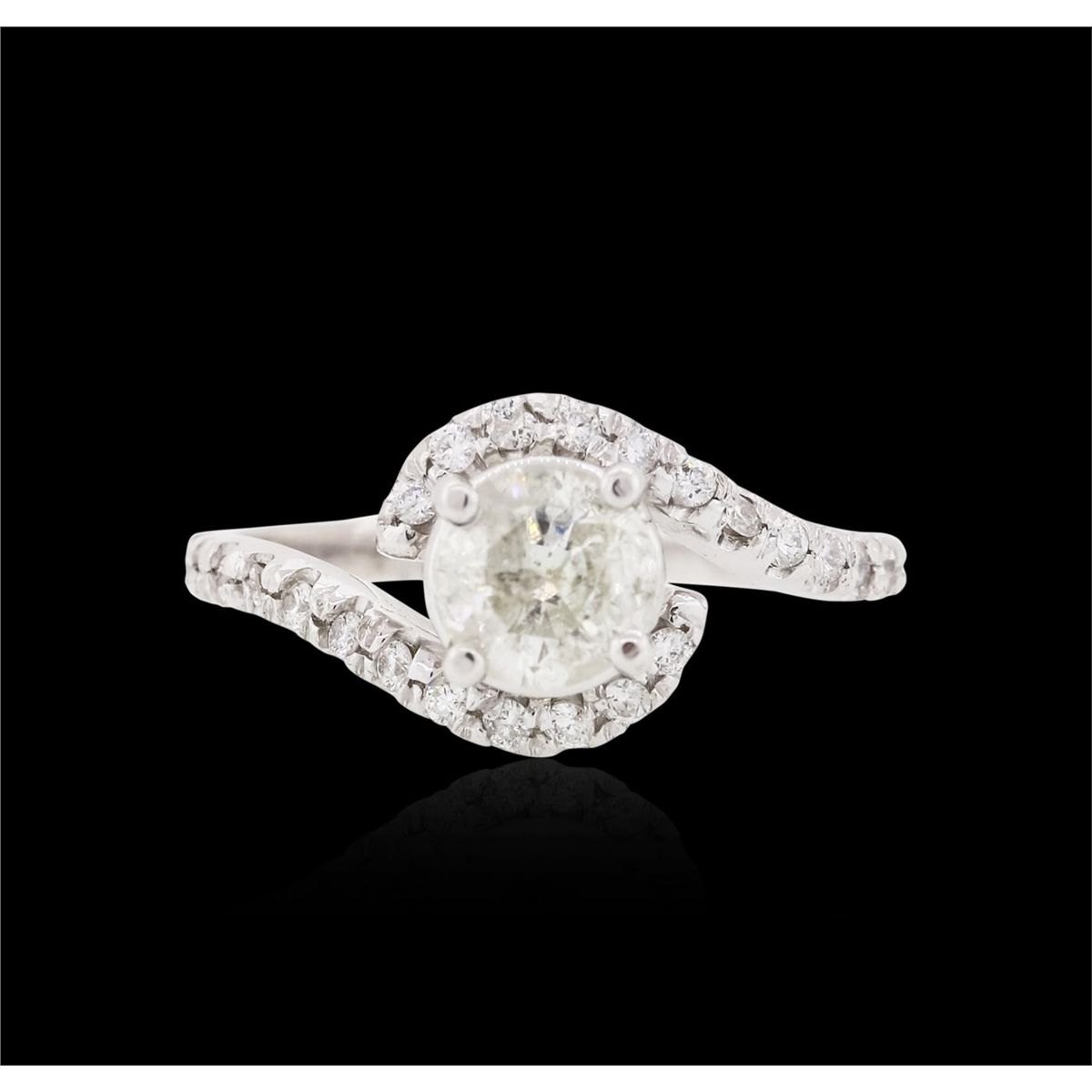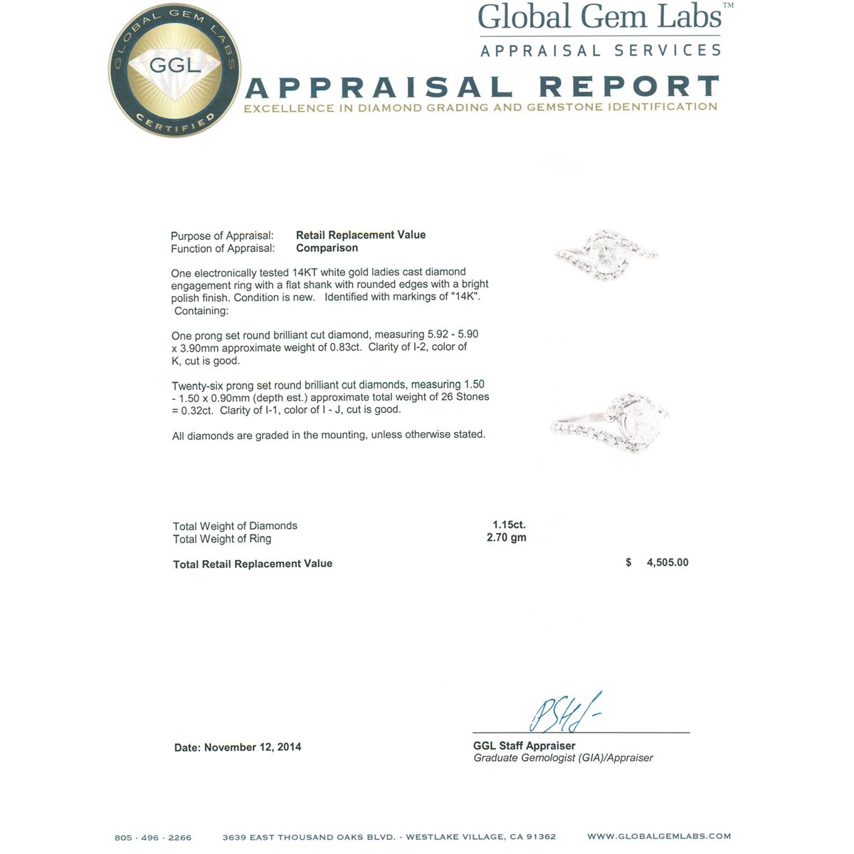 One electronically tested 14KT white gold ladies cast diamond engagement ring with a flat shank with rounded edges with a bright polish finish. Identified with markings of "14K". Condition is new. Containing: One prong set round brilliant cut diamond, measuring 5.92 - 5.90 x 3.90mm approximate weight of 0.83ct. Clarity: I-2. Color: K, Cut is Good. Twenty-Six prong set round brilliant cut diamonds, measuring 1.50 - 1.50 x 0.90mm (depth est.) approximate total weight of 26 Stones = 0.32ct. Clarity: I-1. Color: I - J, Cut is Good. All diamonds are graded in the mounting, unless otherwise stated. Total Weight of Diamonds 1.15ct. Total Weight of Ring 2.70 grams. GGL Appraised at $4,505.00.