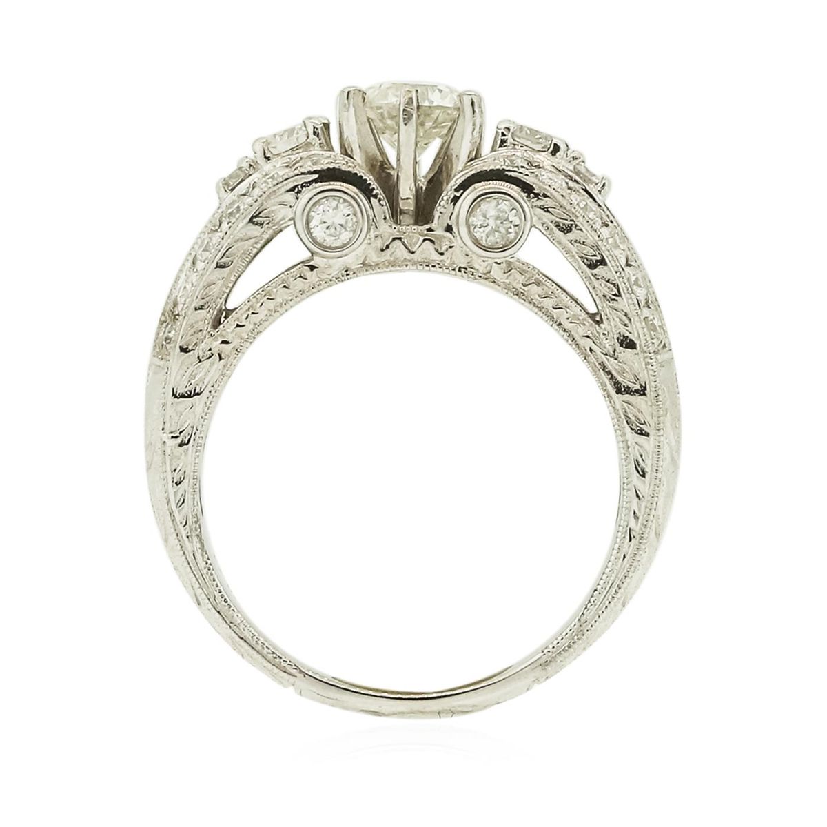 One electronically tested 14KT white gold ladies combination cast & assembled engagement ring with a flat shank with a engraved finish. Identified with markings of "14K". Condition is new. Containing: One prong set round brilliant cut diamond, measuring 5.40 - 5.40 x 3.07mm (depth est.) approximate weight of 0.55ct. Clarity: I-1. Color: J, Cut is Good. Thirty-Two prong set round brilliant cut diamonds, measuring 2.60 - 1.40 x 1.20mm (depth est.) approximate total weight of 32 Stones = 0.60ct. Clarity: SI-2 to I-2. Color: I, Cut is Good. All diamonds are graded in the mounting, unless otherwise stated. Total Weight of Diamonds 1.15ct. Total Weight of Ring 6.00 grams. GGL Appraised at $6,640.00.