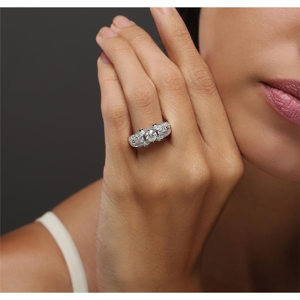 One electronically tested 14KT white gold ladies combination cast & assembled engagement ring with a flat shank with a engraved finish. Identified with markings of "14K". Condition is new. Containing: One prong set round brilliant cut diamond, measuring 5.40 - 5.40 x 3.07mm (depth est.) approximate weight of 0.55ct. Clarity: I-1. Color: K, Cut is Good. Thirty-Two prong set round brilliant cut diamonds, measuring 2.60 - 1.40 x 1.20mm (depth est.) approximate total weight of 32 Stones = 0.60ct. Clarity: SI-2 to I-2. Color: I - J, Cut is Good. All diamonds are graded in the mounting, unless otherwise stated. Total Weight of Diamonds 1.15ct. Total Weight of Ring 6.00 grams. GGL Appraised at $6,350.00.