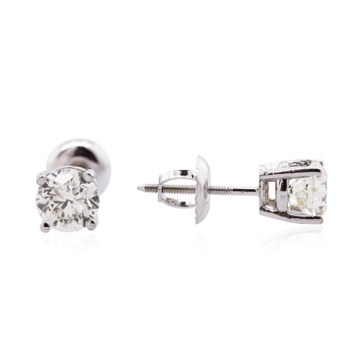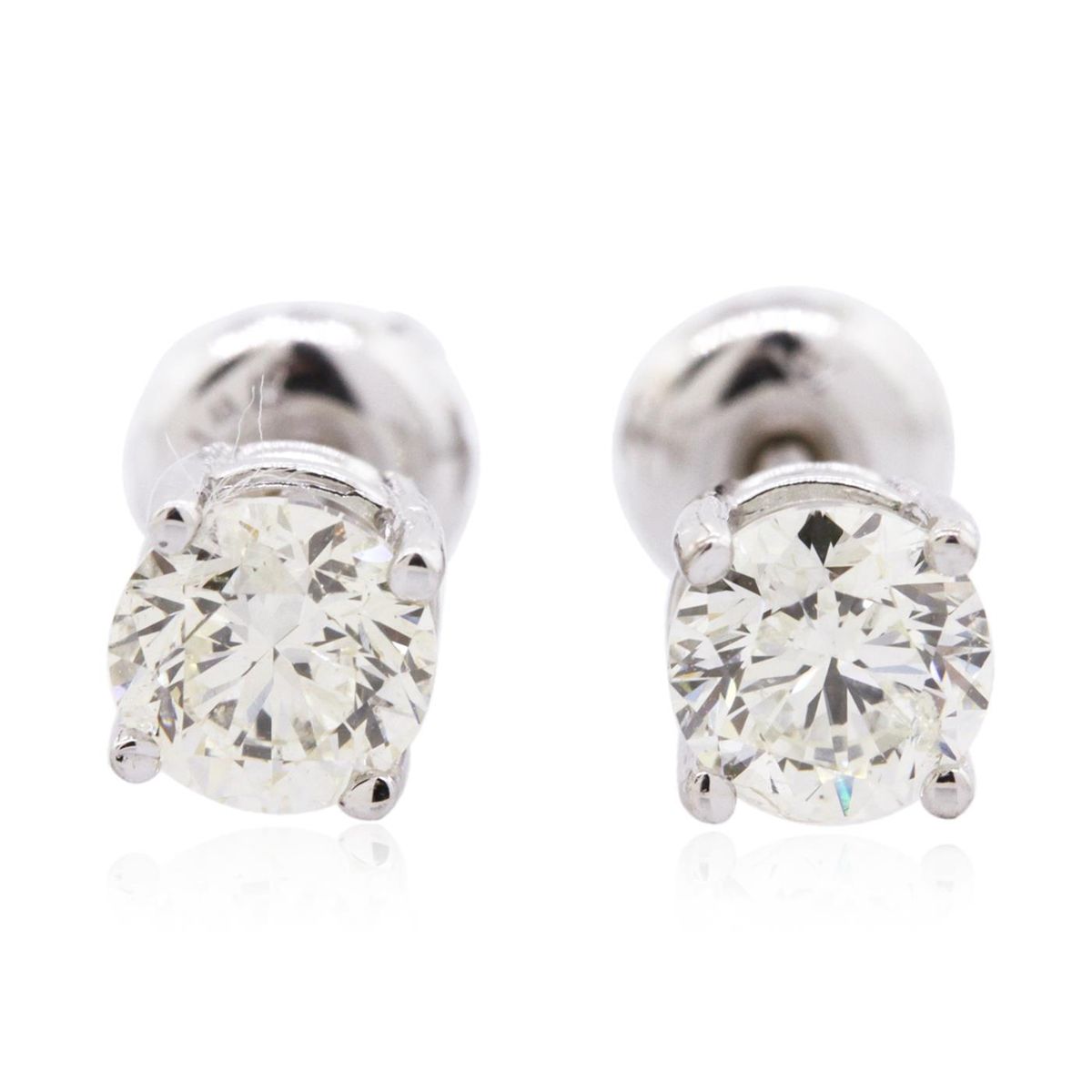 One pair electronically tested 14KT white gold cast & assembled diamond solitaire earrings with screw backs. Bright polish finish. Condition is new, good workmanship. Containing: One prong set round brilliant cut diamond, measuring 4.90 - 4.85 x 3.20mm (depth est.), 4.00% GTCF approximate weight of 0.58ct with a medium blue fluorescence. Graded in the setting. Clarity: SI-2. Color: 65.6%. Table 61.5%. One prong set round brilliant cut diamond, measuring 4.89 - 4.87 x 3.20mm (depth est.), 3.00% GTCF approximate weight of 0.57ct with a faint blue fluorescence. Graded in the setting. Clarity: I-1. Color: 65.6%. Table 57.4%. Total Weight of Diamonds 1.15ct. Total Weight of Earrings 1.02 grams. AIG Appraised at $5,265.00.