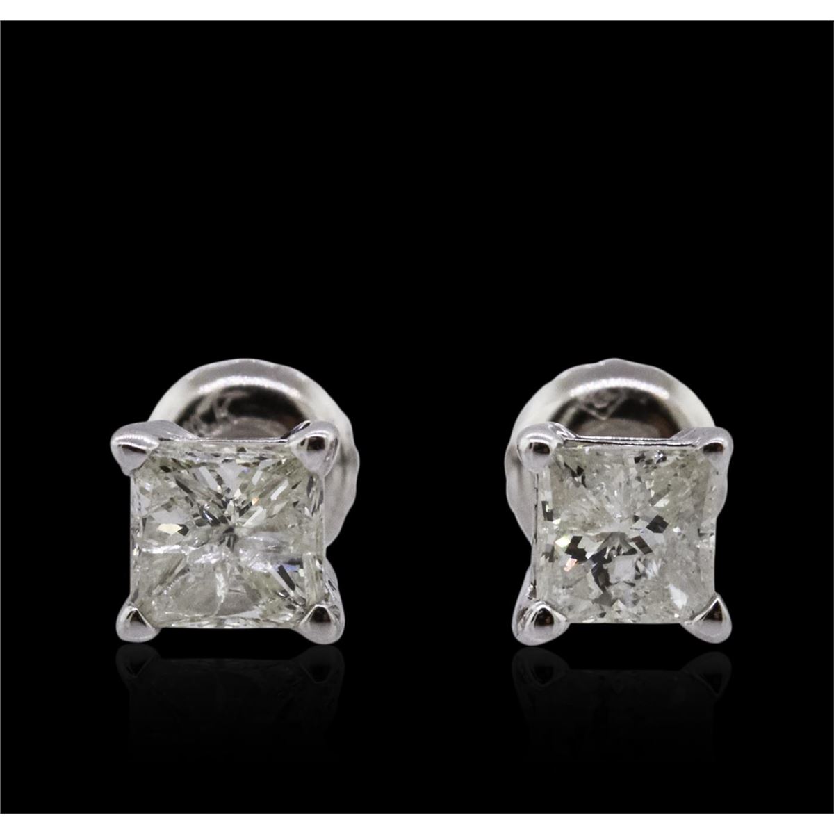 One pair electronically tested 14KT white gold cast & assembled diamond solitaire earrings with screw backs. Bright polish finish. Condition is new, good workmanship. Containing: One prong set princess cut diamond, measuring 4.30 x 4.20 x 3.50mm (depth est.), 4.00.%. GTCF approximate weight of 0.64ct with a faint red fluorescence. Graded in the setting. Clarity: I-2. Color: 83.3%. Table 88.1%. One prong set princess cut diamond, measuring 4.05 x 4.00 x 2.90mm (depth est.), 6.00.%. GTCF approximate weight of 0.51ct with a medium blue fluorescence. Graded in the setting. Clarity: I-2. Color: 72.5%. Table 82.5%. Total Weight of Diamonds 1.15ct. Total Weight of Earrings 1.00 grams. AIG Appraised at $2,355.00.