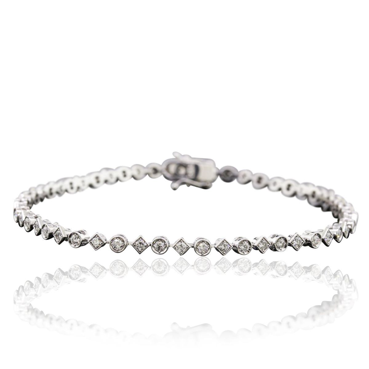 One electronically tested 14KT white gold ladies combination cast & assembled diamond tennis bracelet with a hidden box clasp with safety closer with a bright polish finish. Measurements: 7.50" in length. Identified with markings of "585". Condition is new. Containing: Fifty-Four prong set round brilliant cut diamonds, measuring 1.90 - 1.70 x 1.08mm (depth est.) approximate total weight of 54 Stones = 1.15ct. . Clarity: SI-2 to I-1. Color: H - I, Cut is Good. All diamonds are graded in the mounting, unless otherwise stated.. Total Weight of Diamonds 1.15ct.. Total Weight of Tennis Bracelet 7.80 grams.