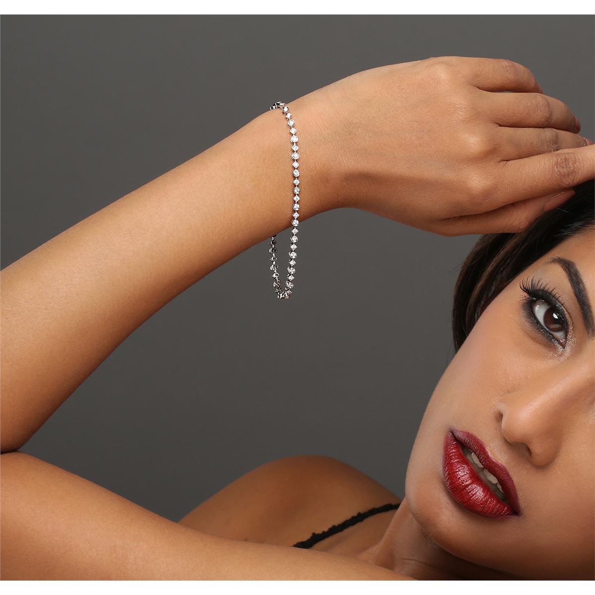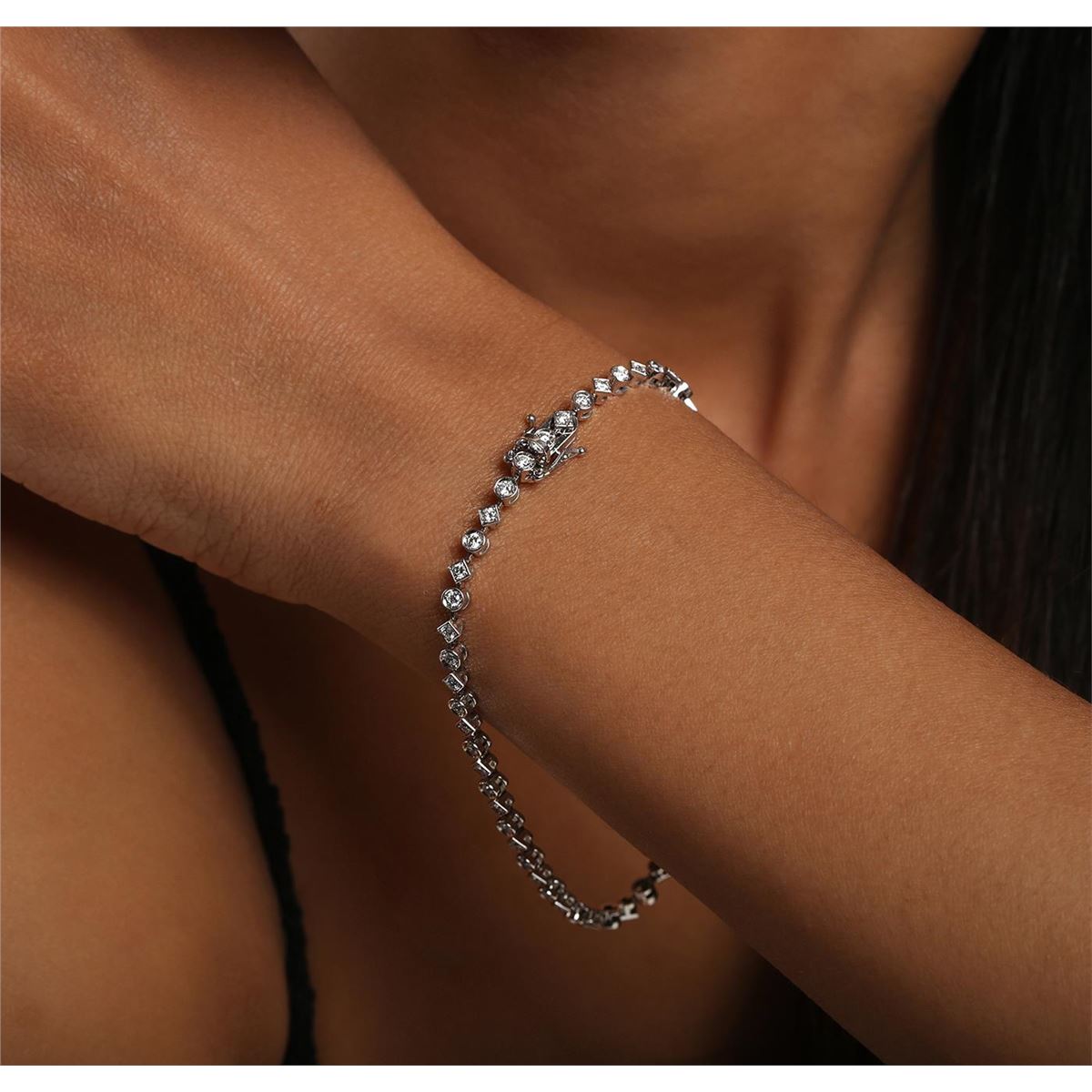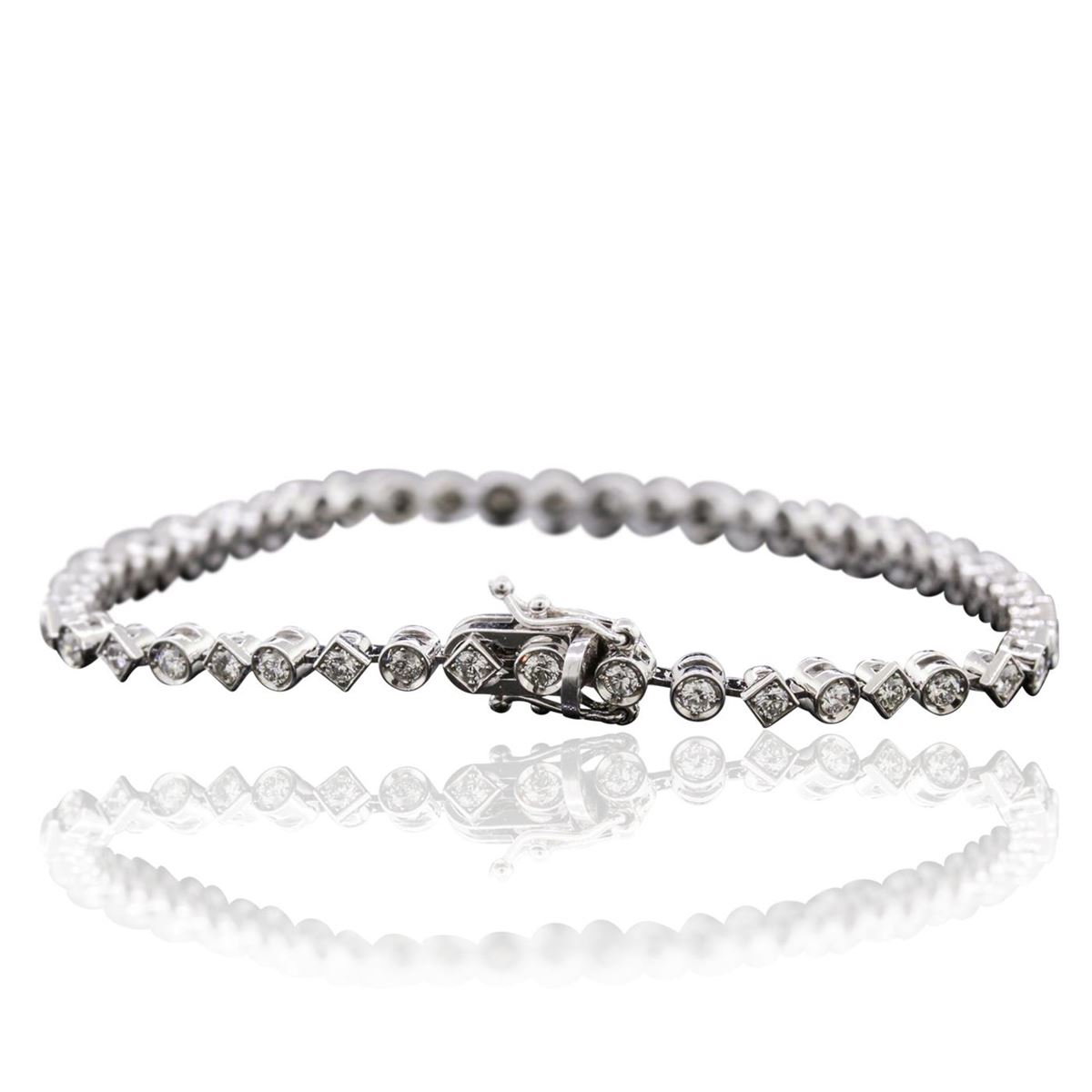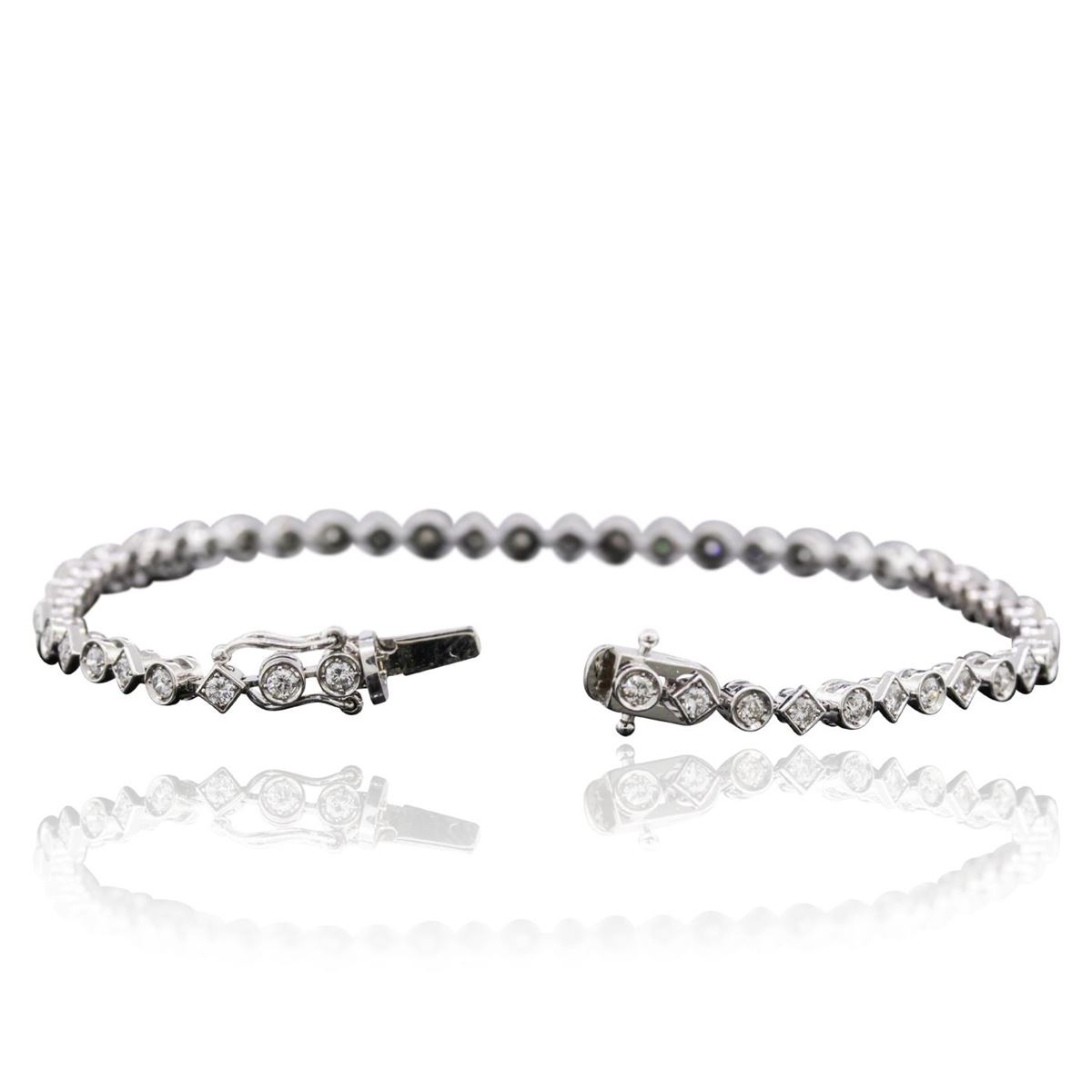 One electronically tested 14KT white gold ladies combination cast & assembled diamond tennis bracelet with a hidden box clasp with safety closer with a bright polish finish. Measurements: 7.50" in length. Identified with markings of "585". Condition is new. Containing: Fifty-Four prong set round brilliant cut diamonds, measuring 1.90 - 1.70 x 1.08mm (depth est.) approximate total weight of 54 Stones = 1.15ct. . Clarity: SI-2 to I-1. Color: H - I, Cut is Good. All diamonds are graded in the mounting, unless otherwise stated.. Total Weight of Diamonds 1.15ct.. Total Weight of Tennis Bracelet 7.80 grams. GGL Appraised at $5,570.00.