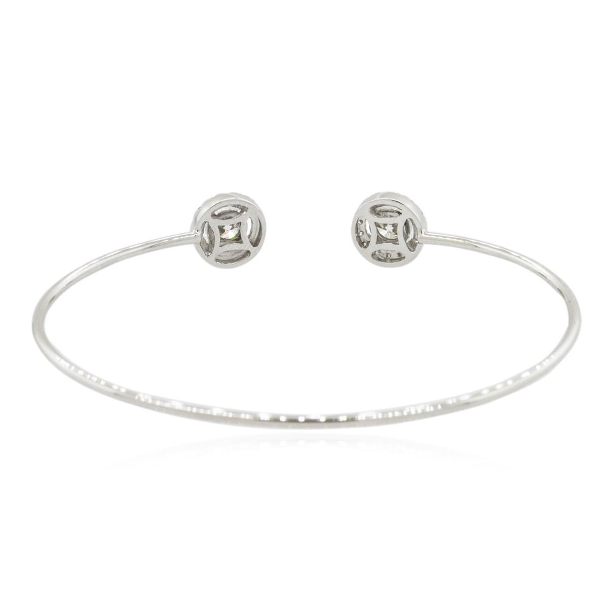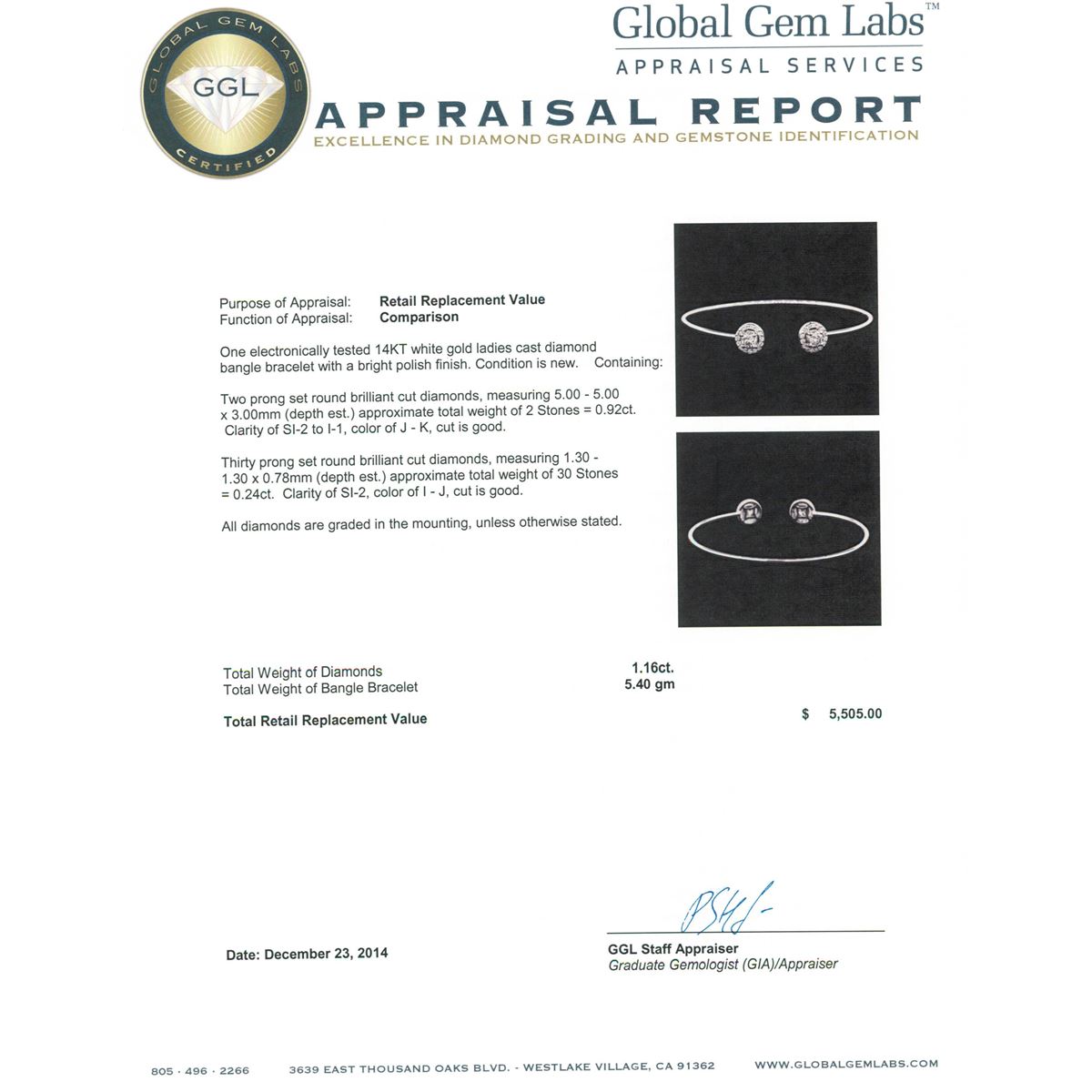 One electronically tested 14KT white gold ladies cast diamond bangle bracelet with a bright polish finish. Condition is new. Containing: Two prong set round brilliant cut diamonds, measuring 5.00 - 5.00 x 3.00mm (depth est.) approximate total weight of 2 Stones = 0.92ct. Clarity: SI-2 to I-1. Color: J - K, Cut is Good. Thirty prong set round brilliant cut diamonds, measuring 1.30 - 1.30 x 0.78mm (depth est.) approximate total weight of 30 Stones = 0.24ct. Clarity: SI-2. Color: I - J, Cut is Good. All diamonds are graded in the mounting, unless otherwise stated. Total Weight of Diamonds 1.16ct. Total Weight of Bangle Bracelet 5.40 grams. GGL Appraised at $5,505.00.
