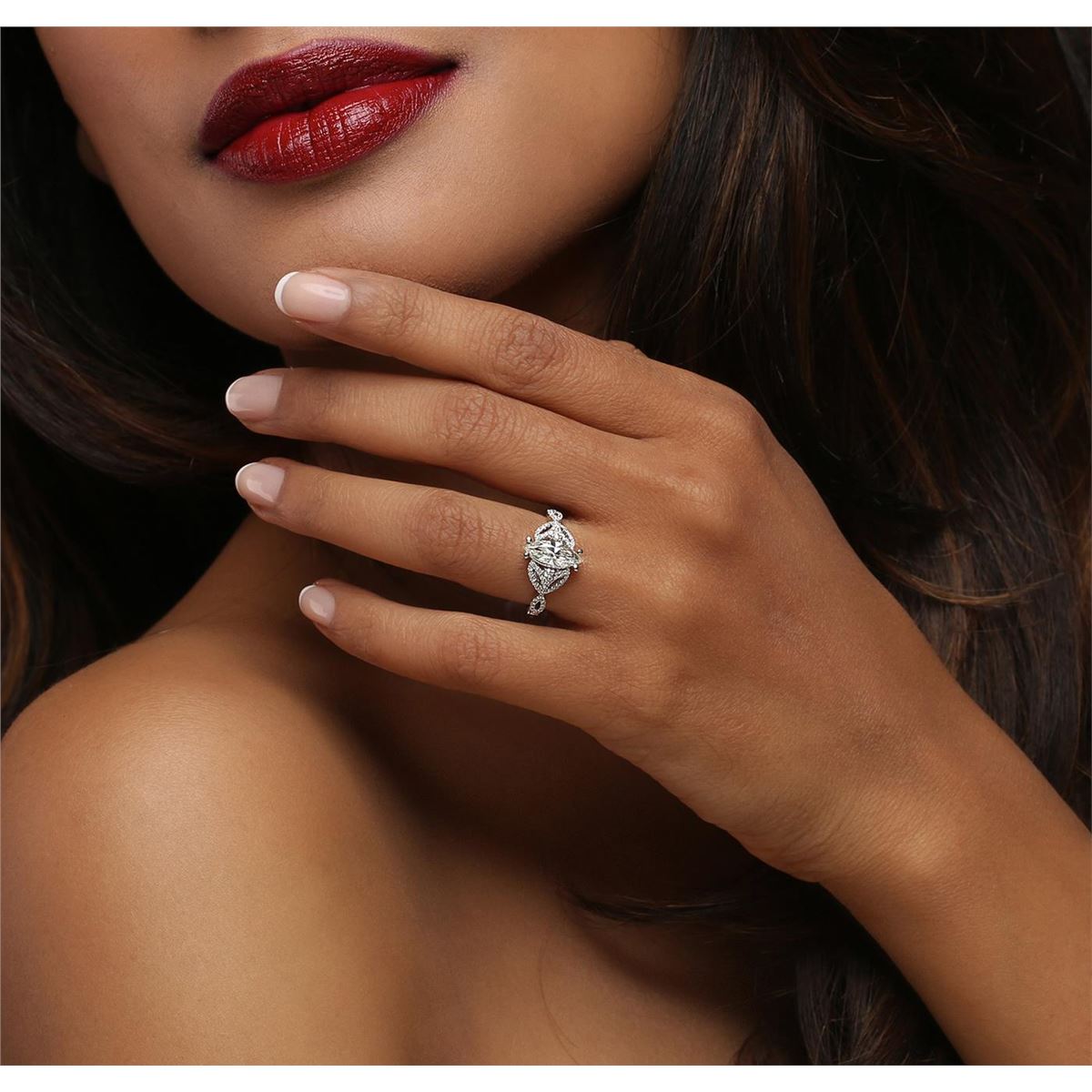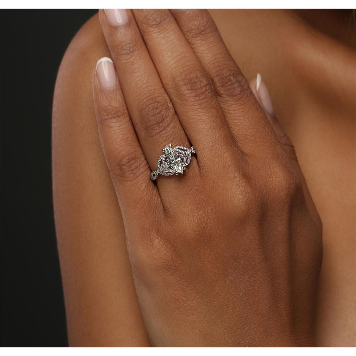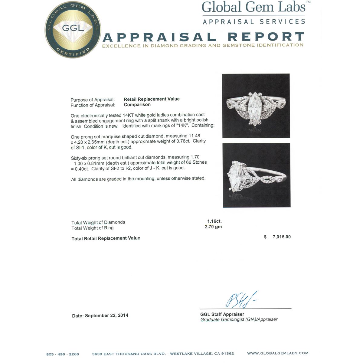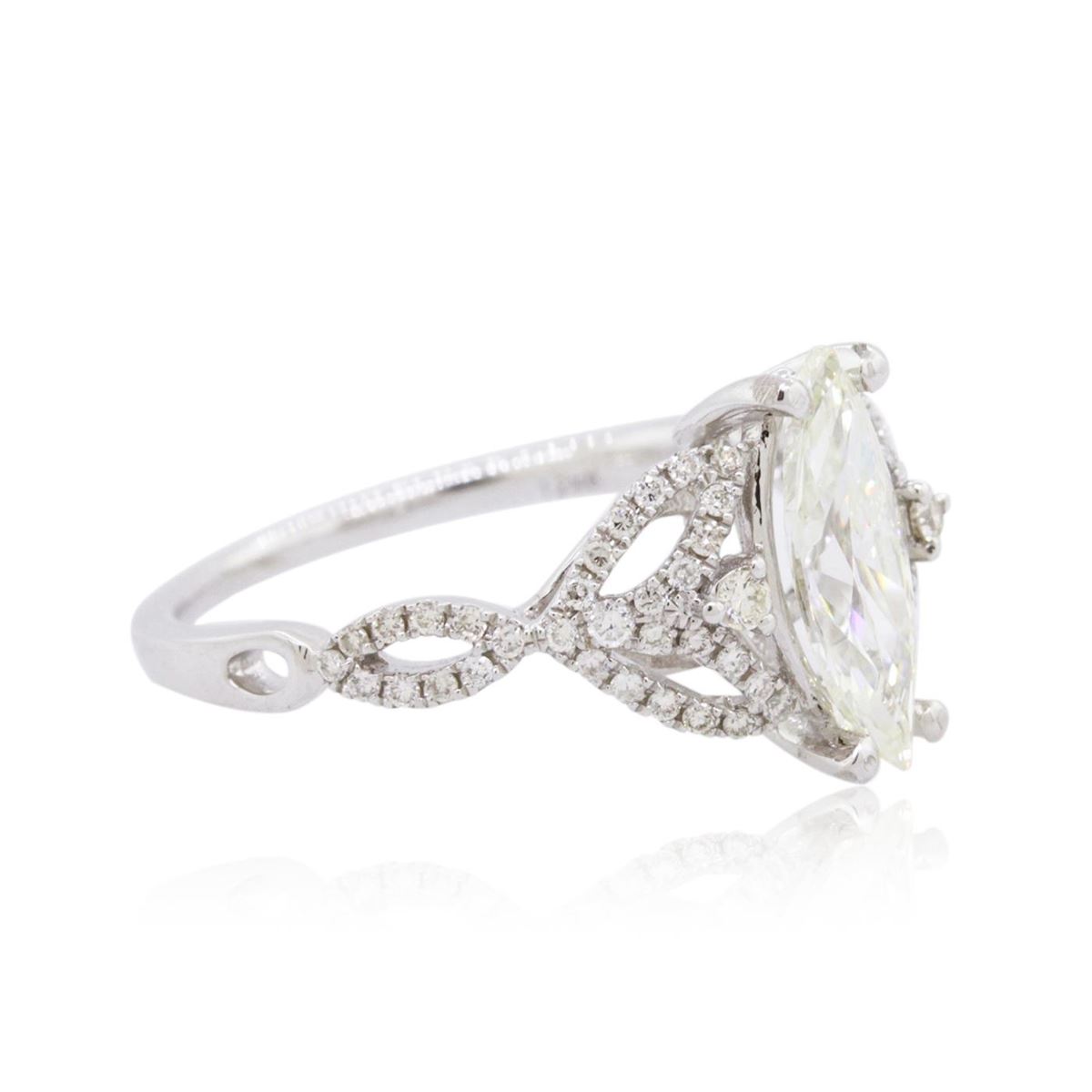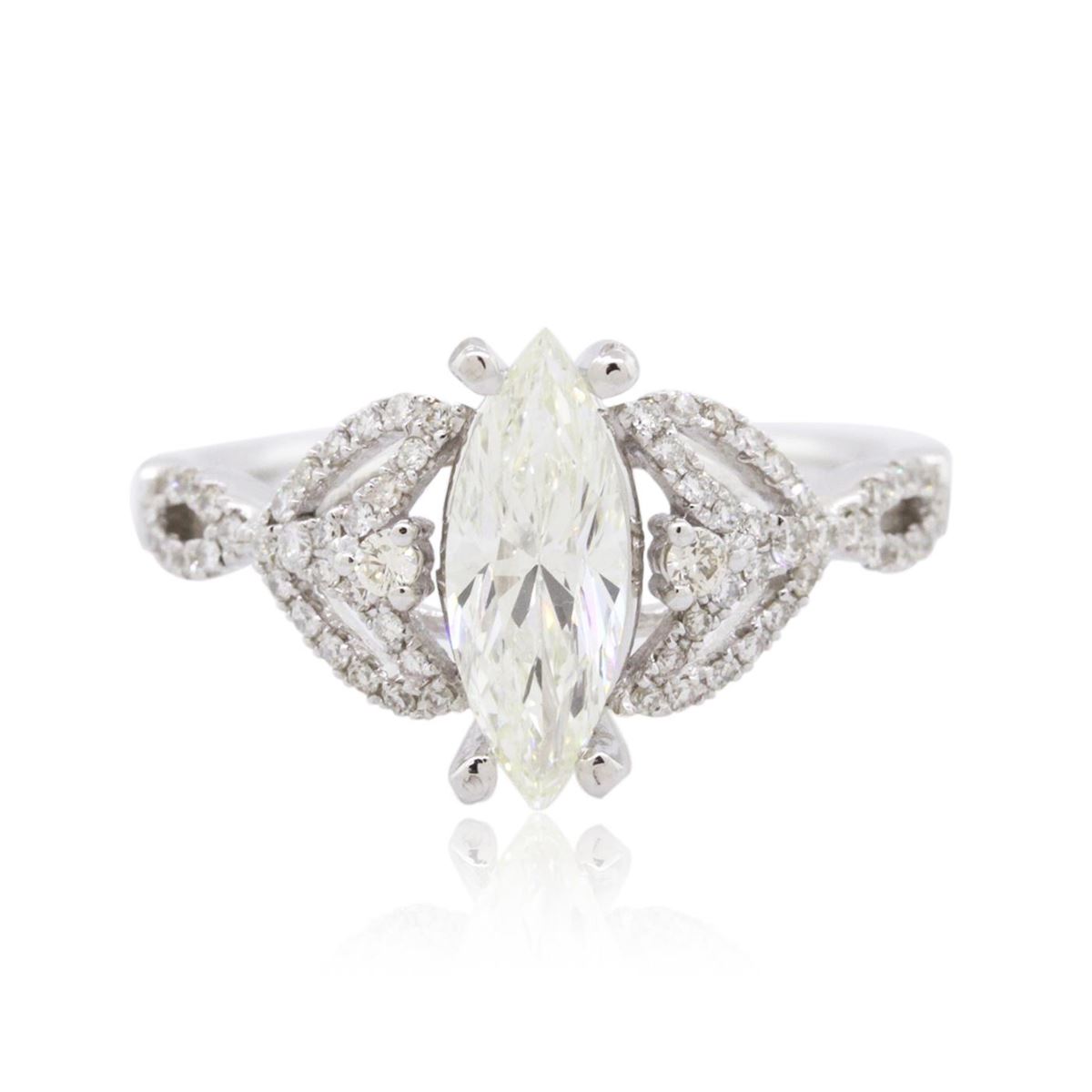 One electronically tested 14KT white gold ladies combination cast & assembled engagement ring with a split shank with a bright polish finish. Identified with markings of "14K". Condition is new. Containing: One prong set marquise shaped cut diamond, measuring 11.48 x 4.20 x 2.65mm (depth est.) approximate weight of 0.76ct. Clarity: SI-1. Color: K, Cut is Good. Sixty-Six prong set round brilliant cut diamonds, measuring 1.70 - 1.00 x 0.81mm (depth est.) approximate total weight of 66 Stones = 0.40ct. Clarity: SI-2 to I-2. Color: J - K, Cut is Good. All diamonds are graded in the mounting, unless otherwise stated. Total Weight of Diamonds 1.16ct. Total Weight of Ring 2.70 grams. GGL Appraised at $7,015.00.