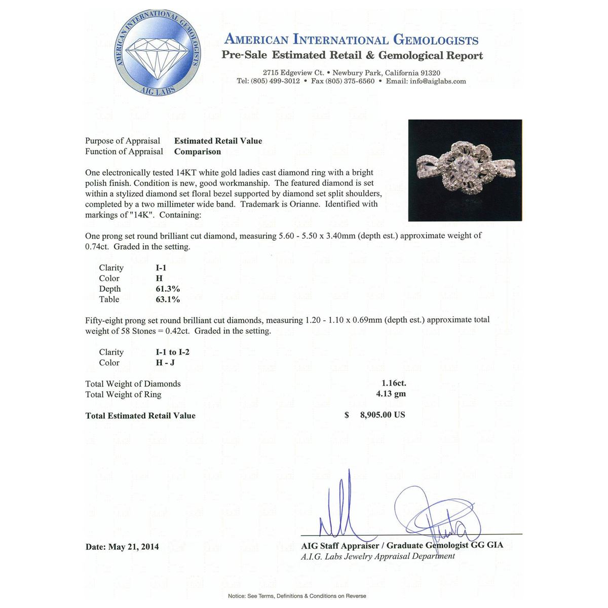 One electronically tested 14KT white gold ladies cast diamond ring with a bright polish finish. The featured diamond is set within a stylized diamond set floral bezel supported by diamond set split shoulders, completed by a two millimeter wide band. Trademark is Orianne. Identified with markings of "14K". Condition is new, good workmanship. Containing: One prong set round brilliant cut diamond, measuring 5.60 - 5.50 x 3.40mm (depth est.) approximate weight of 0.74ct. Graded in the setting. Clarity: I-1 . Color: HDepth 61.3%. Table 63.1%. Fifty-Eight prong set round brilliant cut diamonds, measuring 1.20 - 1.10 x 0.69mm (depth est.) approximate. Total Weight of 58 Stones = 0.42ct. Graded in the setting. Clarity: I-1 to I-2 . Color: H - J. Total Weight of Diamonds 1.16ct. Total Weight of Ring 4.13gm. AIG Appraised at $8,905.00.
