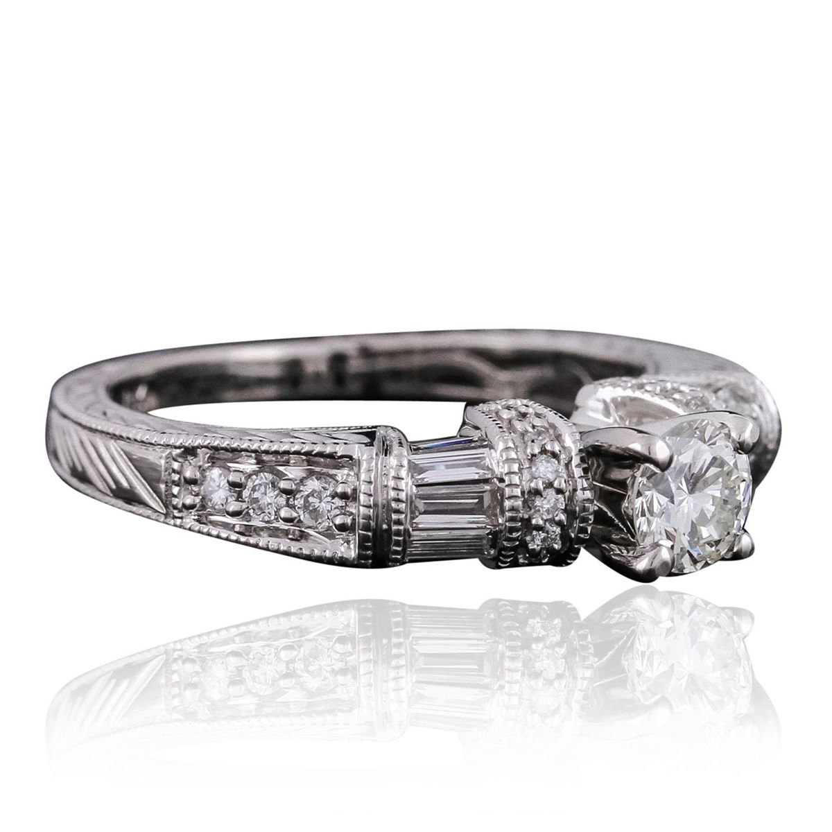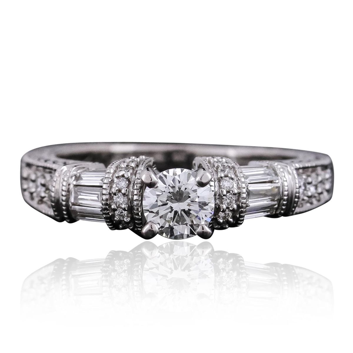 One electronically tested 14KT white gold ladies combination cast & assembled engagement ring with a bright polish finish. Identified with markings of "14K". Condition is new. Containing: One prong set round brilliant cut diamond, measuring 5.00 - 5.00 x 3.00mm (depth est.) approximate weight of 0.46ct. Clarity: VS-2. Color: J, Cut is Very Good. Ten channel set baguette cut diamonds, measuring 3.00 x 1.50 x 1.28mm (depth est.) approximate total weight of 10 Stones = 0.53ct. Clarity: VS-2. Color: J, Cut is Good. Twenty-Four prong set round brilliant cut diamonds, measuring 1.50 - 1.00 x 0.75mm (depth est.) approximate total weight of 24 Stones = 0.17ct. Clarity: SI-2 to I-2. Color: J, Cut is Good. All diamonds are graded in the mounting, unless otherwise stated. Total Weight of Diamonds 1.16ct. Total Weight of Ring 4.90 grams. GGL Appraised at $7,090.00.