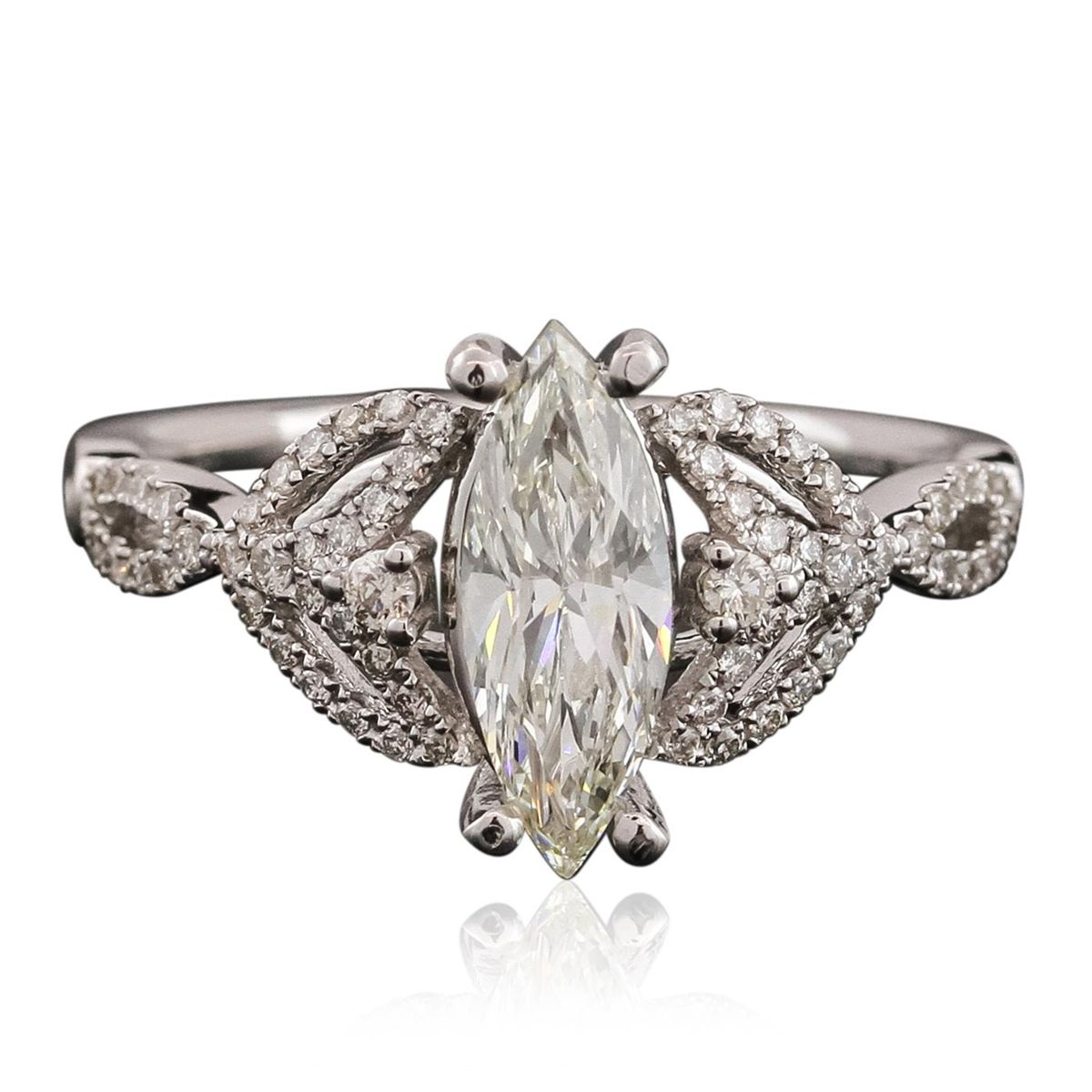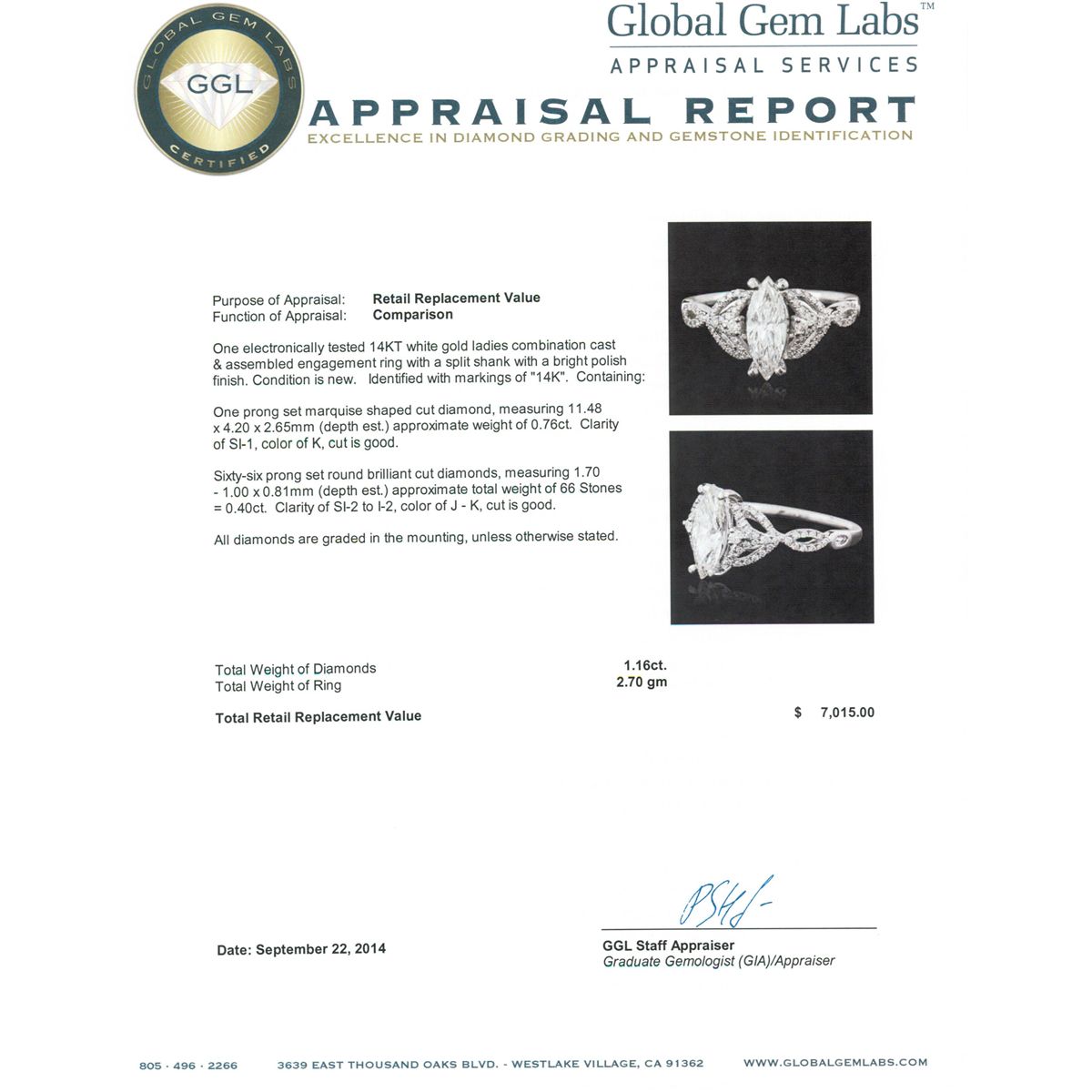 One electronically tested 14KT white gold ladies combination cast & assembled engagement ring with a split shank with a bright polish finish. Identified with markings of "14K". Condition is new. Containing: One prong set marquise shaped cut diamond, measuring 11.48 x 4.20 x 2.65mm (depth est.) approximate weight of 0.76ct. Clarity: SI-1. Color: K, Cut is Good. Sixty-Six prong set round brilliant cut diamonds, measuring 1.70 - 1.00 x 0.81mm (depth est.) approximate total weight of 66 Stones = 0.40ct. Clarity: SI-2 to I-2. Color: J - K, Cut is Good. All diamonds are graded in the mounting, unless otherwise stated. Total Weight of Diamonds 1.16ct. Total Weight of Ring 2.70 grams. GGL Appraised at $7,015.00.
