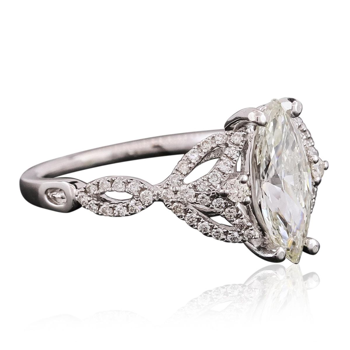 One electronically tested 14KT white gold ladies combination cast & assembled engagement ring with a split shank with a bright polish finish. Identified with markings of "14K". Condition is new. Containing: One prong set marquise shaped cut diamond, measuring 11.48 x 4.20 x 2.65mm (depth est.) approximate weight of 0.76ct. Clarity: SI-1. Color: K, Cut is Good. Sixty-Six prong set round brilliant cut diamonds, measuring 1.70 - 1.00 x 0.81mm (depth est.) approximate total weight of 66 Stones = 0.40ct. Clarity: SI-2 to I-2. Color: J - K, Cut is Good. All diamonds are graded in the mounting, unless otherwise stated. Total Weight of Diamonds 1.16ct. Total Weight of Ring 2.70 grams. GGL Appraised at $7,015.00.