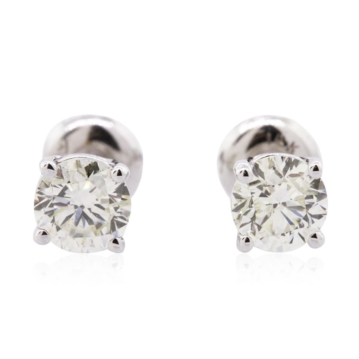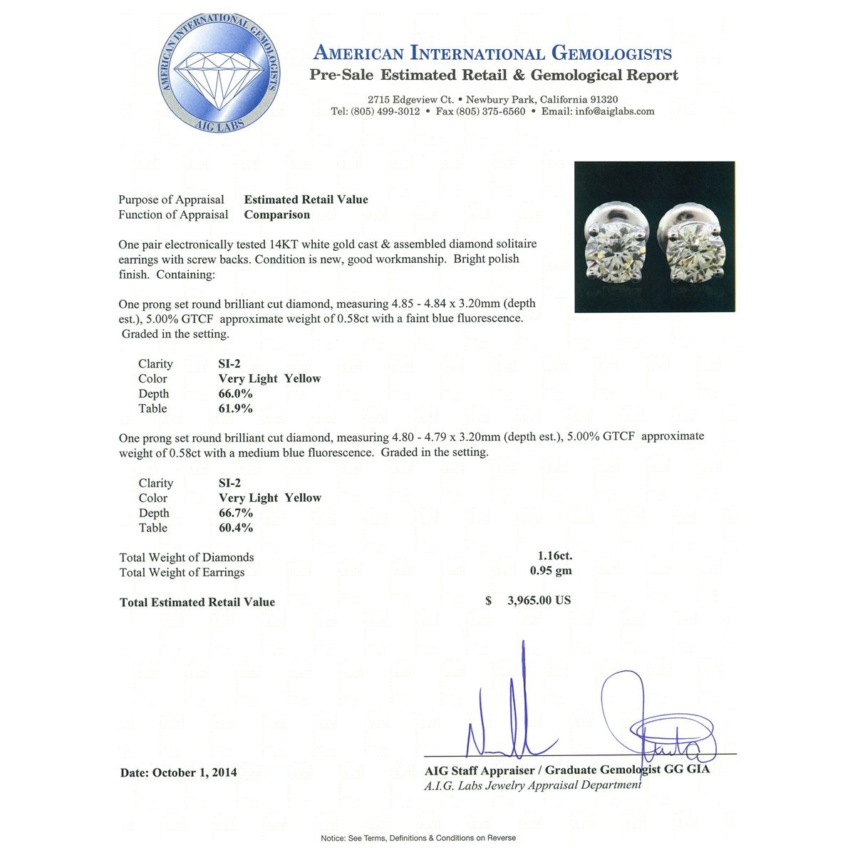 One pair electronically tested 14KT white gold cast & assembled diamond solitaire earrings with screw backs. Bright polish finish. Condition is new, good workmanship. Containing: One prong set round brilliant cut diamond, measuring 4.85 - 4.84 x 3.20mm (depth est.), 5.00% GTCF approximate weight of 0.58ct with a faint blue fluorescence. Graded in the setting. Clarity: SI-2. Depth: 66.0%. Table 61.9%. One prong set round brilliant cut diamond, measuring 4.80 - 4.79 x 3.20mm (depth est.), 5.00% GTCF approximate weight of 0.58ct with a medium blue fluorescence. Graded in the setting. Clarity: SI-2. Depth: 66.7%. Table 60.4%. Total Weight of Diamonds 1.16ct. Total Weight of Earrings 0.95 grams. AIG Appraised at $3,965.00.