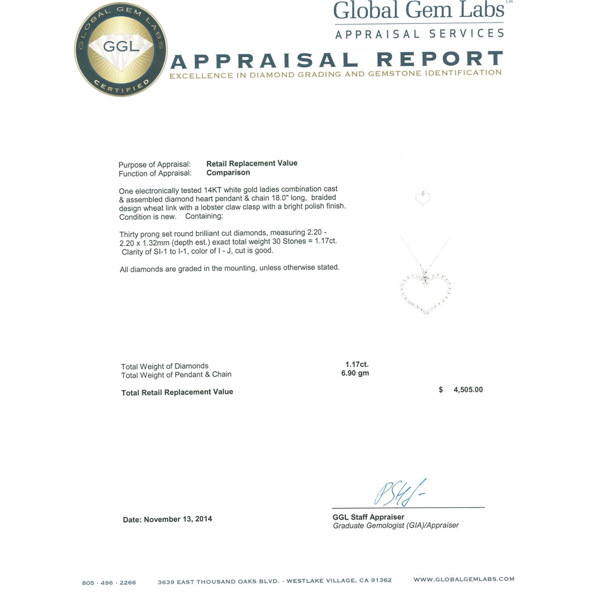 One electronically tested 14KT white gold ladies combination cast & assembled diamond heart pendant & chain 18.0" long, braided design wheat link with a lobster claw clasp with a bright polish finish. Condition is new. Containing: Thirty prong set round brilliant cut diamonds, measuring 2.20 - 2.20 x 1.32mm (depth est.) exact total weight 30 Stones = 1.17ct. Clarity: SI-1 to I-1. Color: I - J, Cut is Good. All diamonds are graded in the mounting, unless otherwise stated. Total Weight of Diamonds 1.17ct. Total Weight of Pendant & Chain 6.90 grams. GGL Appraised at $4,505.00.
