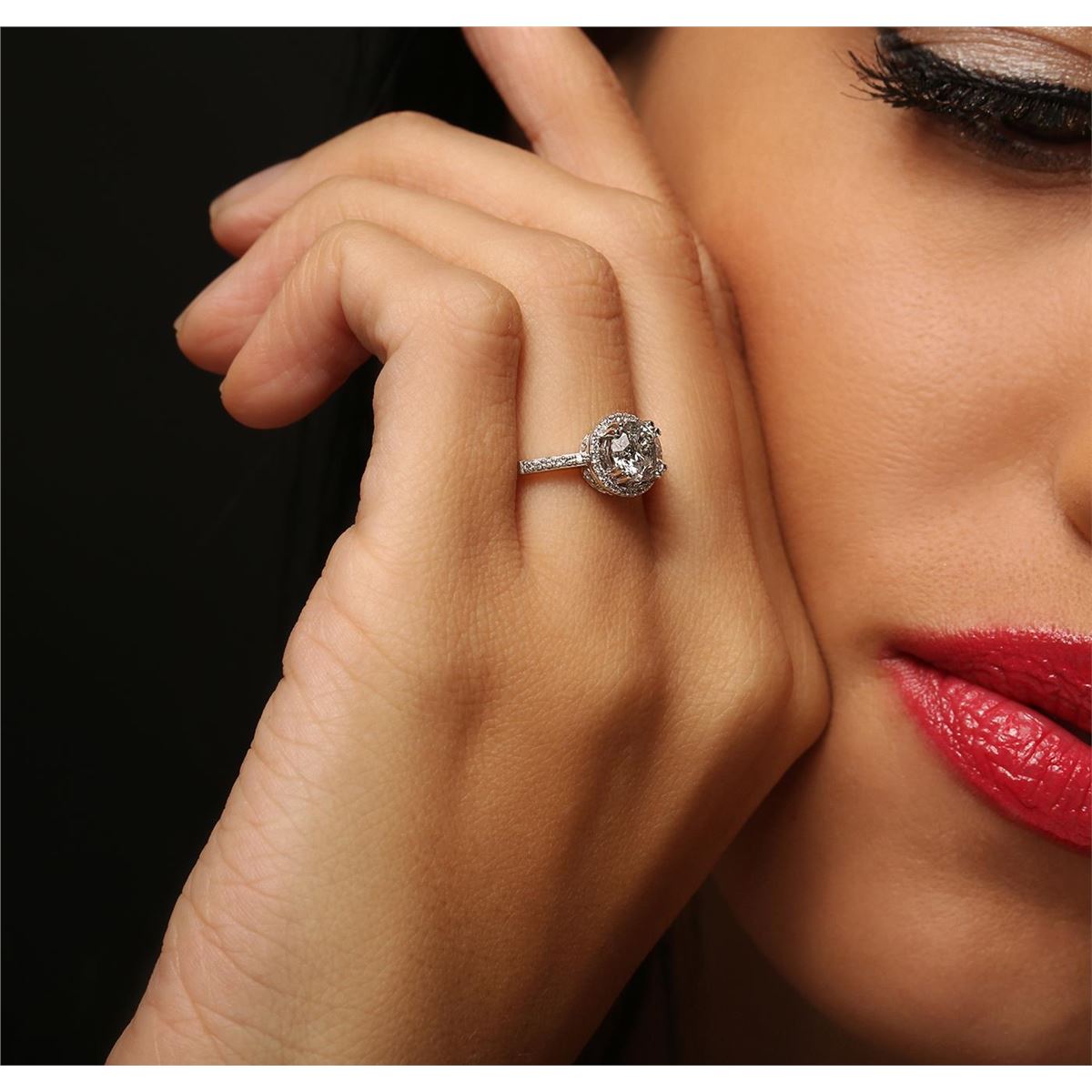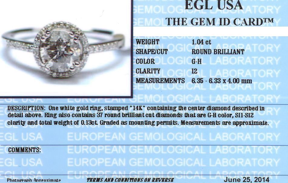 One electronically tested 14KT white gold Ladies combination cast & assembled engagement ring with a bright polish finish. Condition is new. Identified with markings of "14K". Containing: One prong set round brilliant cut diamond, measuring 6.35 - 6.33 x 4.00mm (depth est.) approximate weight of 1.04ct. Clarity: I-2. Color: G, Cut is Good. Thirty-Seven prong set round brilliant cut diamonds, measuring 1.00 - 1.00 x 0.60mm (depth est.) approximate. Total Weight of 37 Stones = 0.13ct. Clarity: SI-1 to SI-2. Color: G - H, Cut is Good. EGL USA GEM ID# US 911348417D. All diamonds are graded in the mounting, unless otherwise stated. Total Weight of Diamonds 1.17ct. Total Weight of Engagement Ring 3.00 grams. GGL Appraised at $10,775.00.