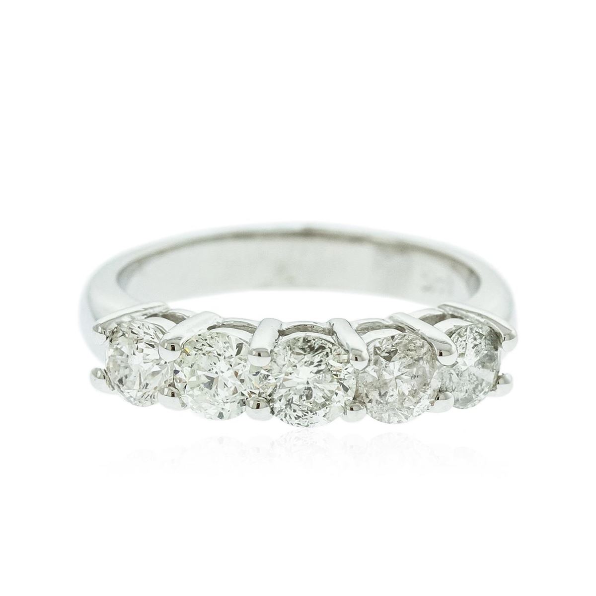 One electronically tested 14KT white gold ladies cast anniversary ring with a bright polish finish. Identified with markings of "14K". Condition is new. Containing: Five prong set round brilliant cut diamonds, measuring 4.00 - 4.00 x 2.40mm (depth est.) approximate total weight of 5 Stones = 1.17ct. Clarity: I-1 to I-2. Color: H - J, Cut is Good. All diamonds are graded in the mounting, unless otherwise stated. Total Weight of Diamonds 1.17ct. Total Weight of Ring 4.40 grams. GGL Appraised at $4,545.00.