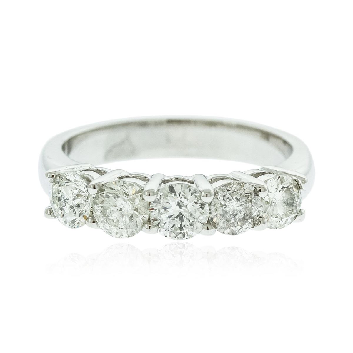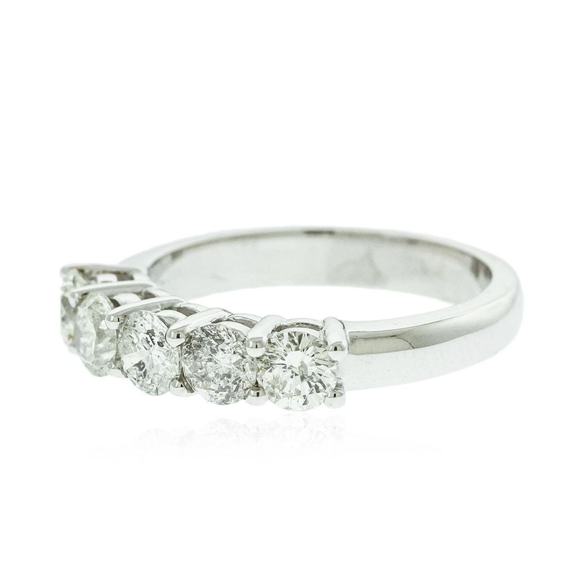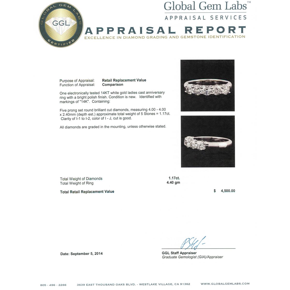 One electronically tested 14KT white gold ladies cast anniversary ring with a bright polish finish. Identified with markings of "14K". Condition is new. Containing: Five prong set round brilliant cut diamonds, measuring 4.00 - 4.00 x 2.40mm (depth est.) approximate total weight of 5 Stones = 1.17ct. Clarity: I-1 to I-2. Color: I - J, Cut is Good. All diamonds are graded in the mounting, unless otherwise stated. Total Weight of Diamonds 1.17ct. Total Weight of Ring 4.40 grams. GGL Appraised at $4,500.00.
