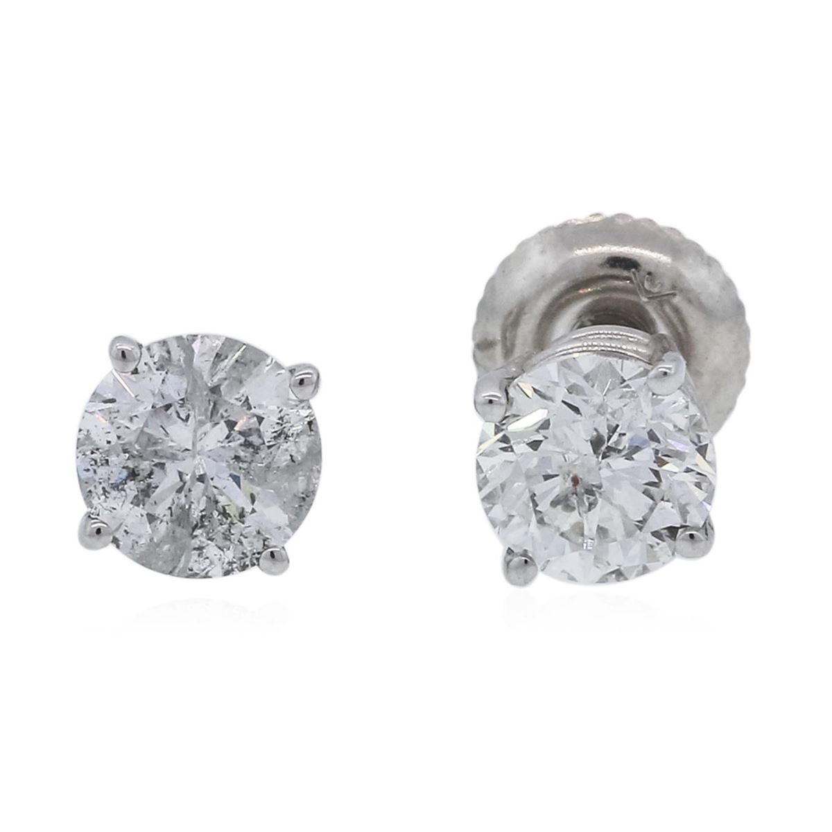 One pair electronically tested 14KT white gold ladies cast diamond stud earrings with friction posts with a bright polish finish. Identified with markings of "14K". Condition is new. Containing: One prong set round brilliant cut diamond, measuring 5.50 - 5.40 x 3.27mm (depth est.) approximate weight of 0.59ct. Clarity: I-3. Color: J, Cut is Good. One prong set round brilliant cut diamond, measuring 5.40 - 5.40 x 3.24mm (depth est.) approximate weight of 0.58ct. Clarity: I-1. Color: J, Cut is Good. All diamonds are graded in the mounting, unless otherwise stated. Total Weight of Diamonds 1.17ct. Total Weight of Earrings 1.10 grams. GGL Appraised at $3,845.00.
