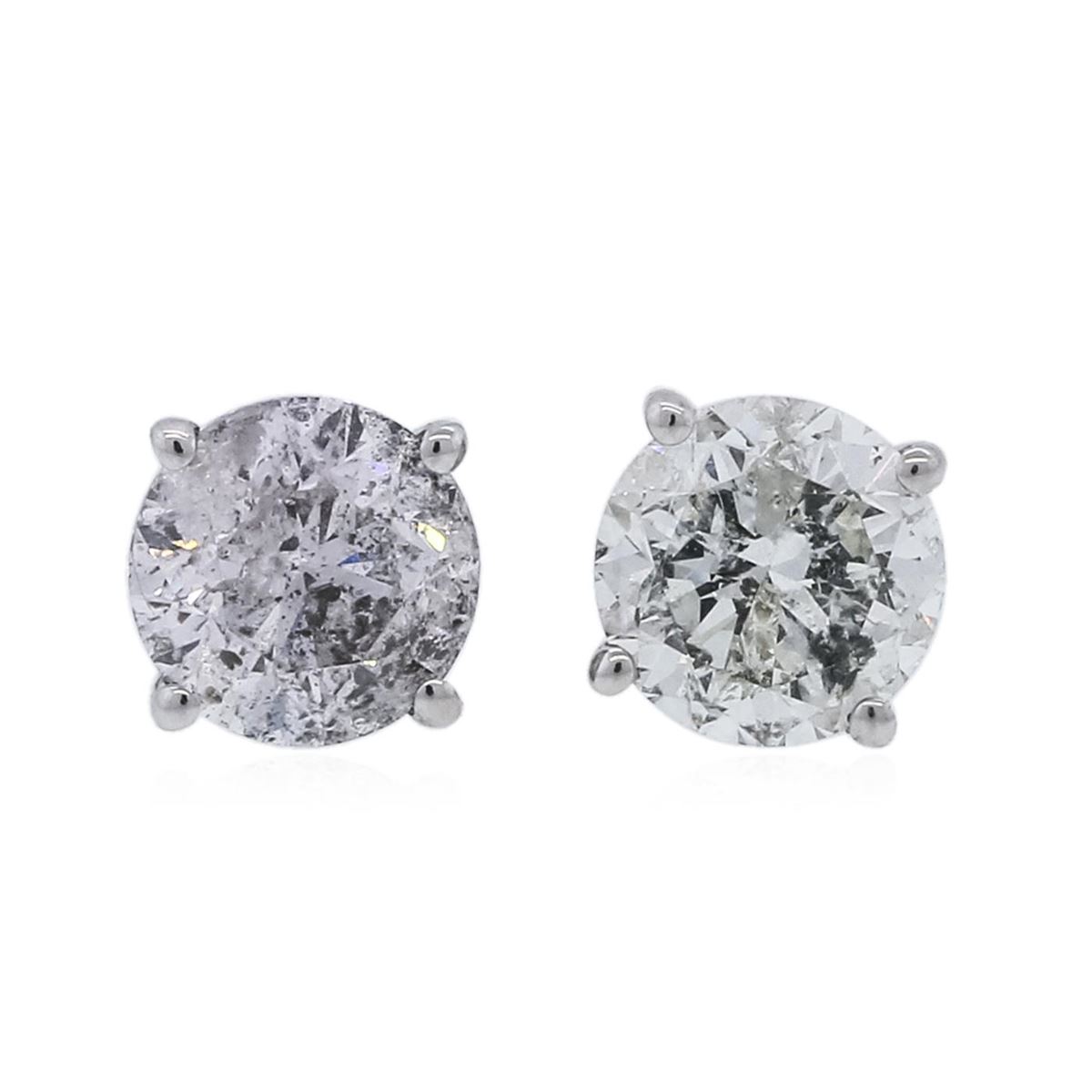One pair electronically tested 14KT white gold ladies cast diamond stud earrings with friction posts with a bright polish finish. Identified with markings of "14K". Condition is new. Containing: One prong set round brilliant cut diamond, measuring 5.50 - 5.40 x 3.27mm (depth est.) approximate weight of 0.59ct. Clarity: I-3. Color: J, Cut is Good. One prong set round brilliant cut diamond, measuring 5.40 - 5.40 x 3.24mm (depth est.) approximate weight of 0.58ct. Clarity: I-2. Color: J, Cut is Good. All diamonds are graded in the mounting, unless otherwise stated. Total Weight of Diamonds 1.17ct. Total Weight of Earrings 1.10 grams. GGL Appraised at $3,200.00.