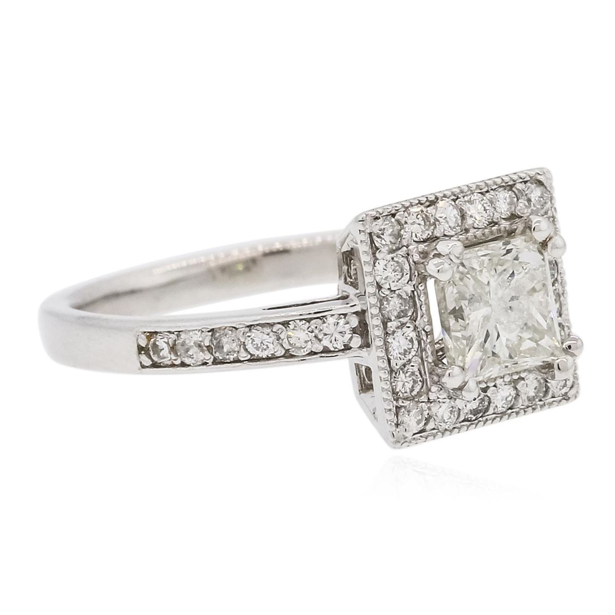 One electronically tested 14KT white gold ladies combination cast & assembled engagement ring with a bright polish finish. Condition is new. Identified with markings of "K14". Containing: One prong set radiant shaped cut diamond, measuring 5.16 x 5.32 x 4.08mm (depth est.) approximate weight of 0.92ct. Clarity: I-2. Color: J, Cut is Good. Thirty-Two prong set round brilliant cut diamonds, measuring 1.30 - 1.30 x 0.78mm (depth est.) approximate total weight of 32 Stones = 0.26ct. Clarity: SI-2 to I-1. Color: I - J, Cut is Good. All diamonds are graded in the mounting, unless otherwise stated. Total Weight of Diamonds 1.17ct. Total Weight of Engagement Ring 3.40 grams. GGL Appraised at $5,390.00.