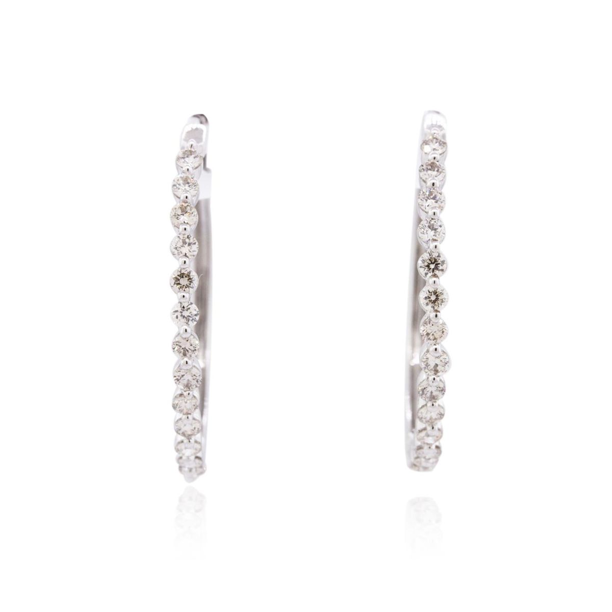 One pair electronically tested 14KT white gold ladies cast diamond hoop earrings with hinged clip backs with a bright polish finish. Identified with markings of "14K". Condition is new. Containing: Thirty prong set round brilliant cut diamonds, measuring 2.20 - 2.20 x 1.32mm (depth est.) approximate total weight of 30 Stones = 1.17ct. Clarity: SI-1 to SI-2. Color: J - K, Cut is Good. All diamonds are graded in the mounting, unless otherwise stated. Total Weight of Diamonds 1.17ct. Total Weight of Earrings 5.70 grams. GGL Appraised at $3,640.00.