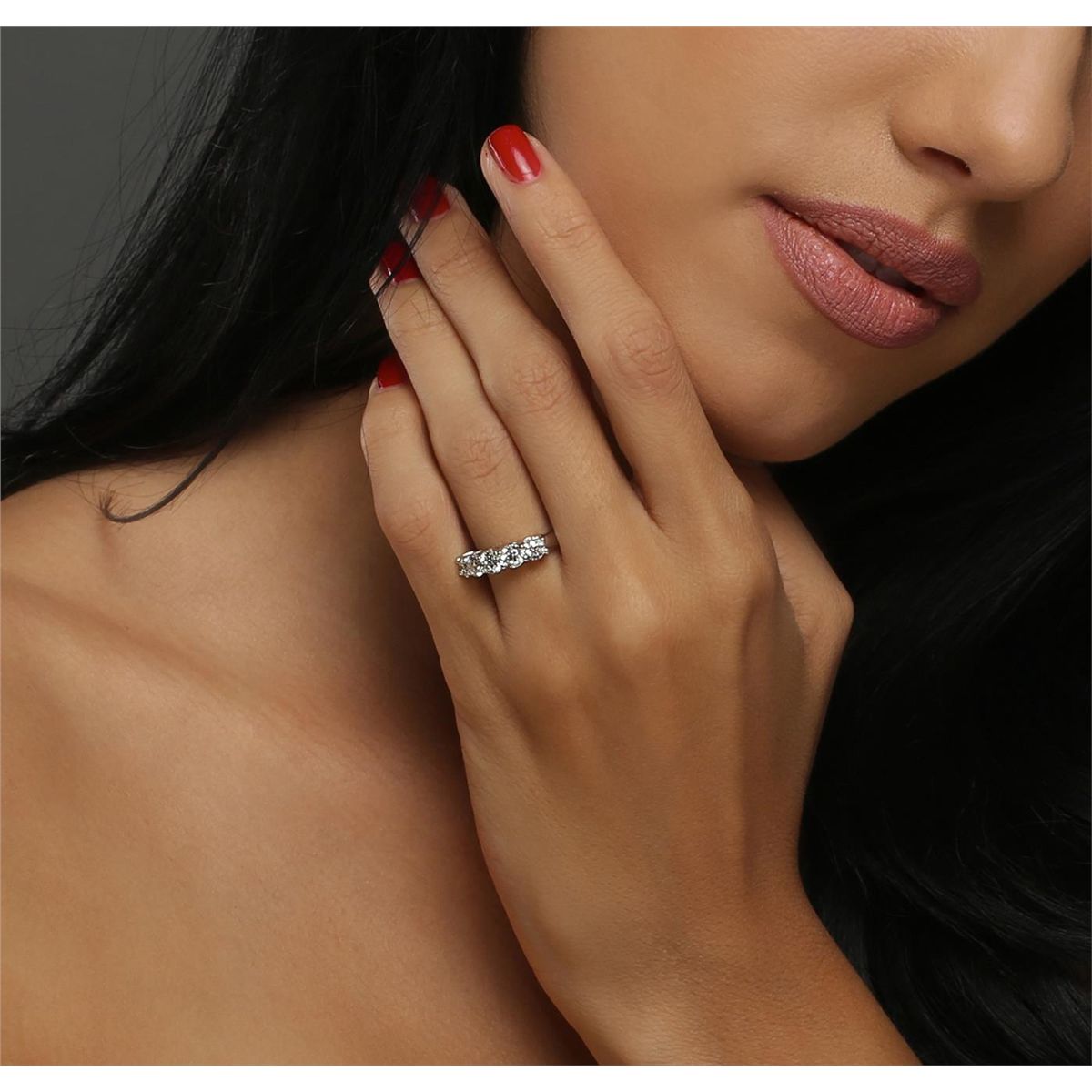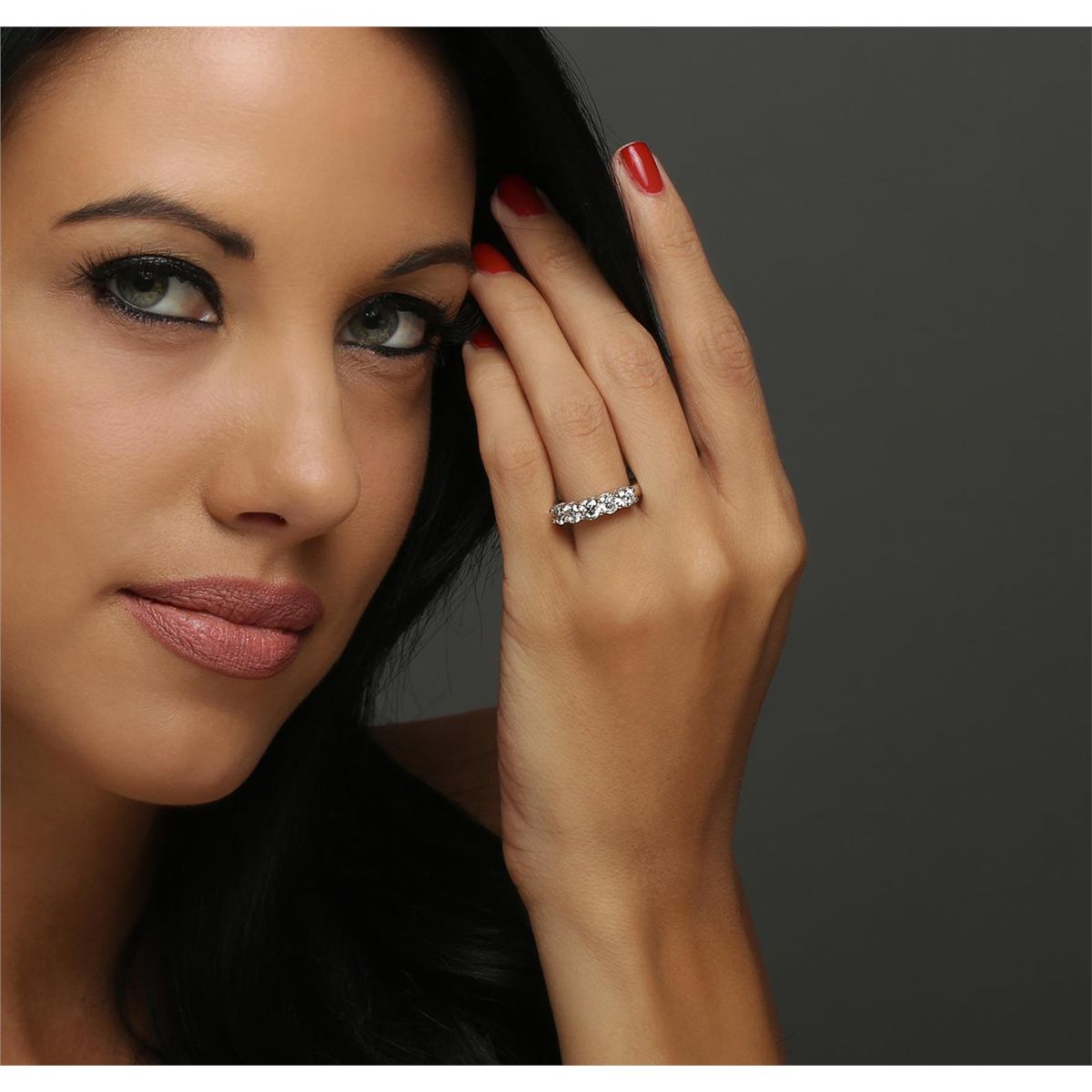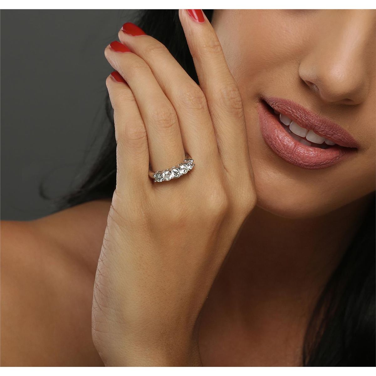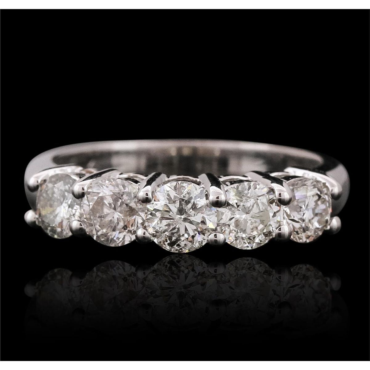 One electronically tested 14KT white gold ladies cast anniversary ring with a bright polish finish. Identified with markings of "14K". Condition is new. Containing: Five prong set round brilliant cut diamonds, measuring 4.00 - 4.00 x 2.40mm (depth est.) approximate total weight of 5 Stones = 1.17ct. Clarity: I-1 to I-2. Color: H - J, Cut is Good. All diamonds are graded in the mounting, unless otherwise stated. Total Weight of Diamonds 1.17ct. Total Weight of Ring 4.40 grams. GGL Appraised at $4,545.00.