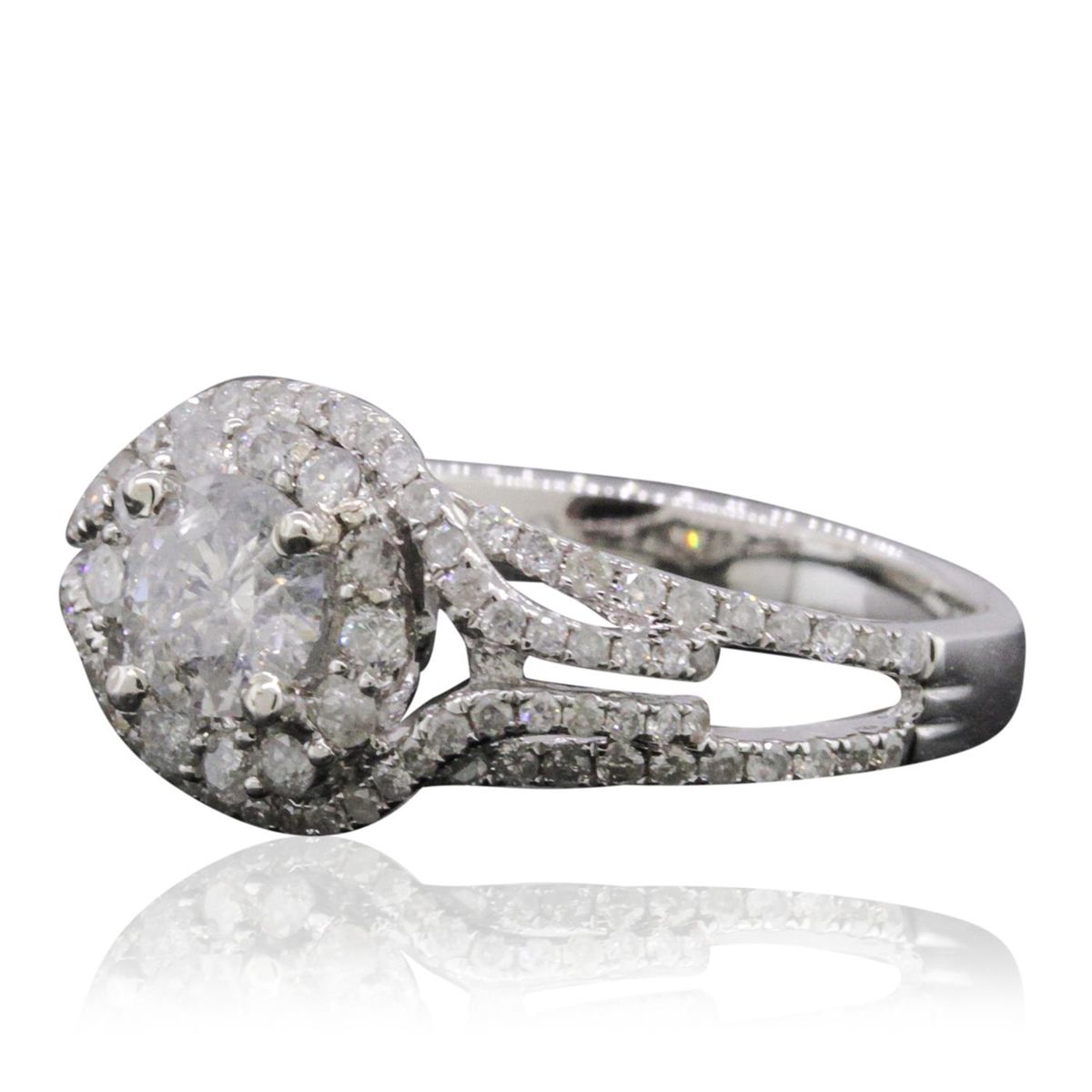 One electronically tested 14KT white gold ladies combination cast & assembled engagement ring with a split shank with a bright polish finish. Identified with markings of "14K". Condition is new. Containing: One prong set round brilliant cut diamond, measuring 5.40 - 5.37 x 3.24mm (depth est.) approximate weight of 0.57ct. Clarity: I-3. Color: J, Cut is Good. One Hundred prong set round brilliant cut diamonds, measuring 1.50 - 1.00 x 0.75mm (depth est.) approximate total weight of 100 Stones = 0.60ct. Clarity: I-1 to I-2. Color: I - J, Cut is Good. All diamonds are graded in the mounting, unless otherwise stated. Total Weight of Diamonds 1.17ct. Total Weight of Ring 4.10 grams. GGL Appraised at $4,025.00.
